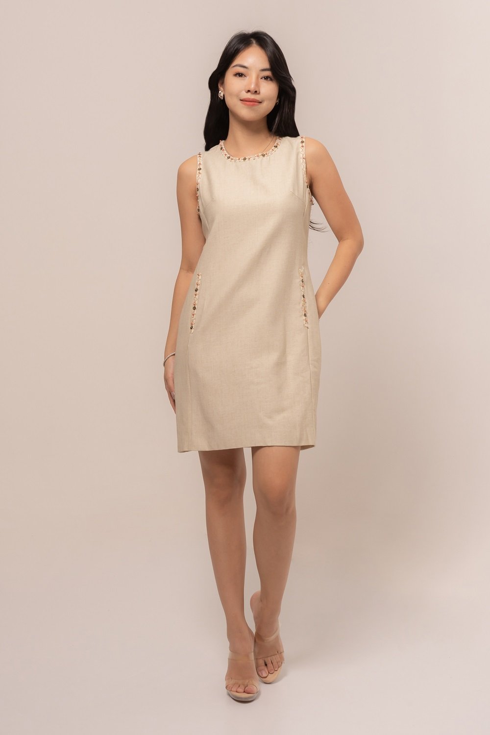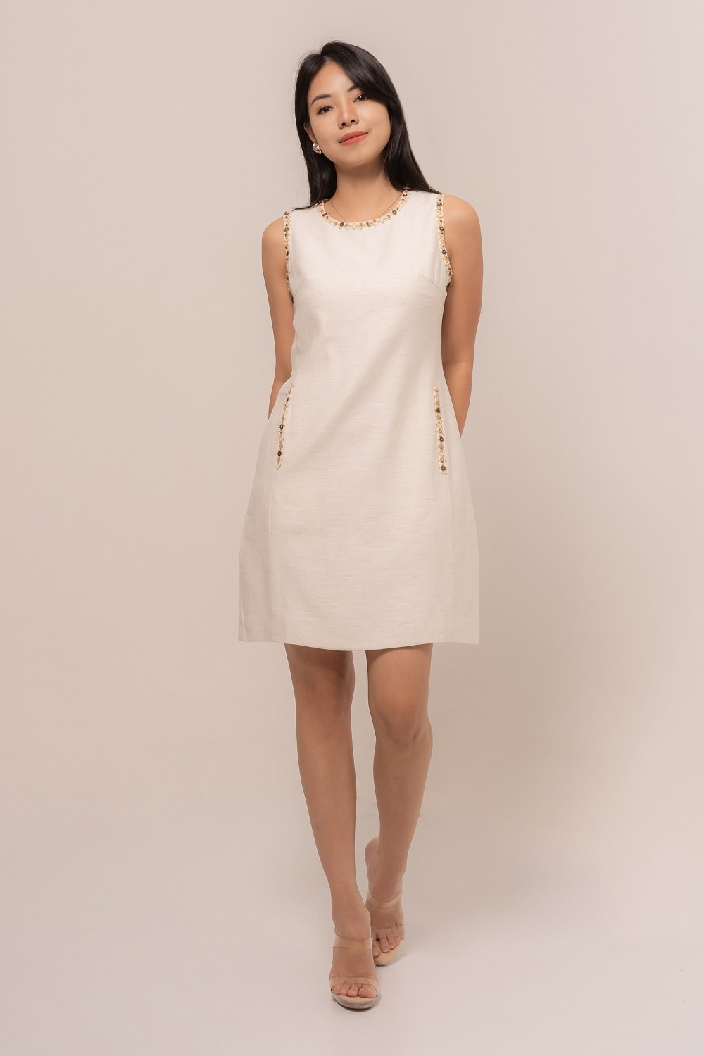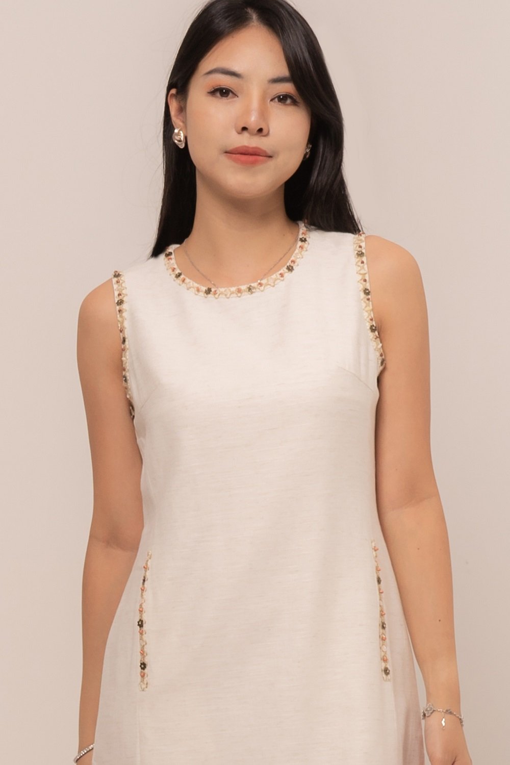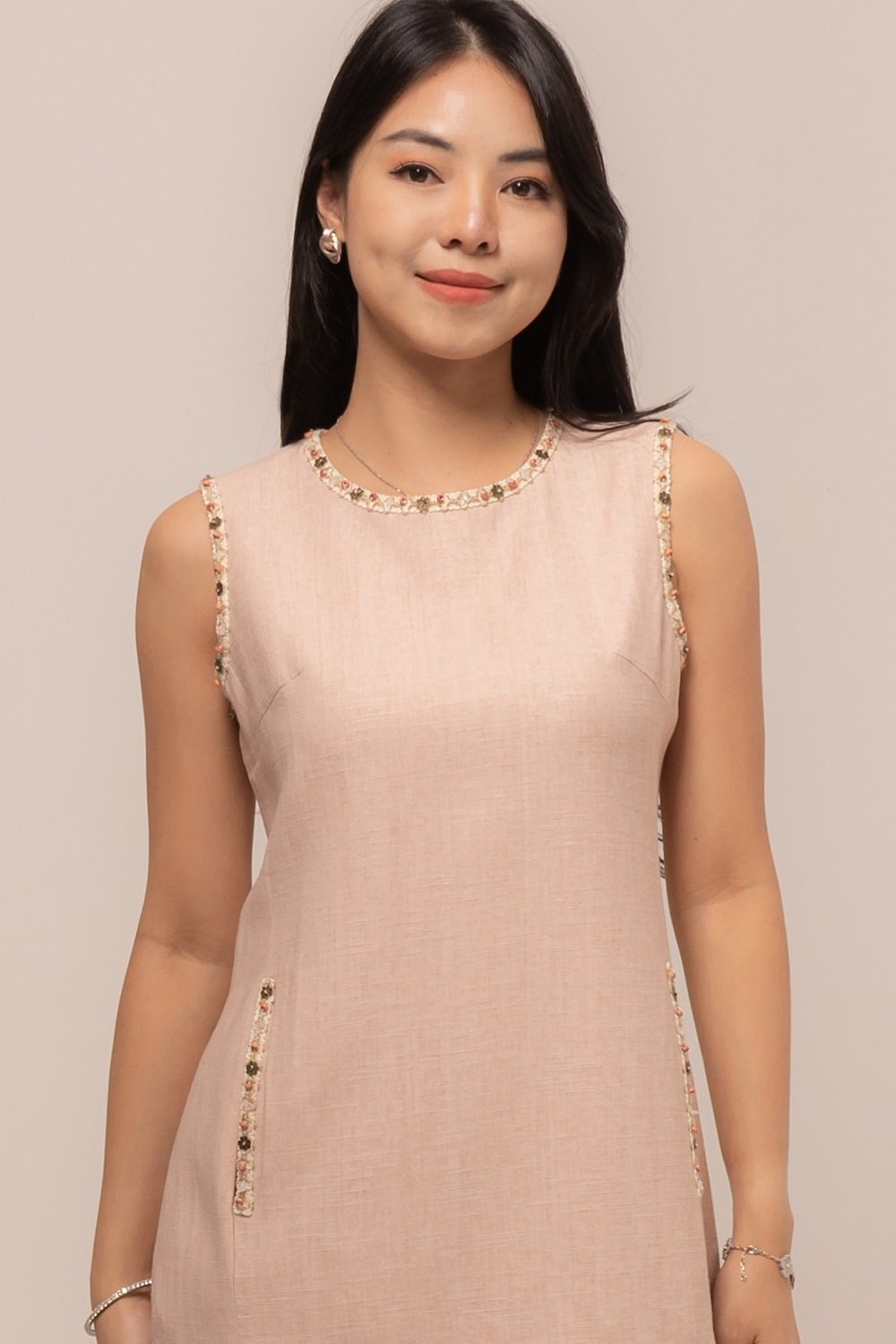 This Azure Dress is beautifully accented with tiny floral bead embellishments, adding a soft, feminine touch to your look.