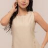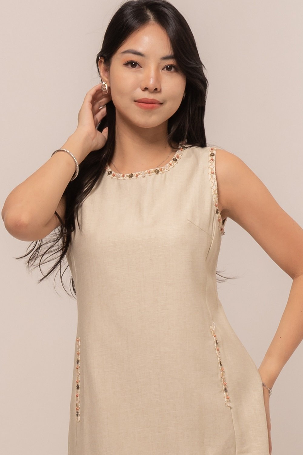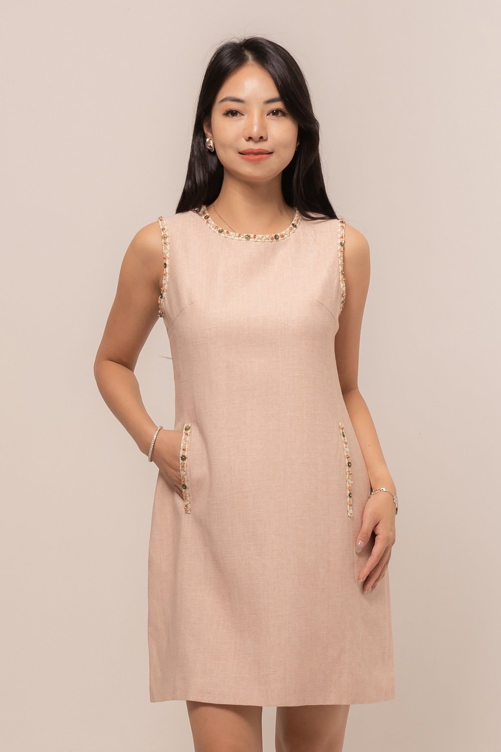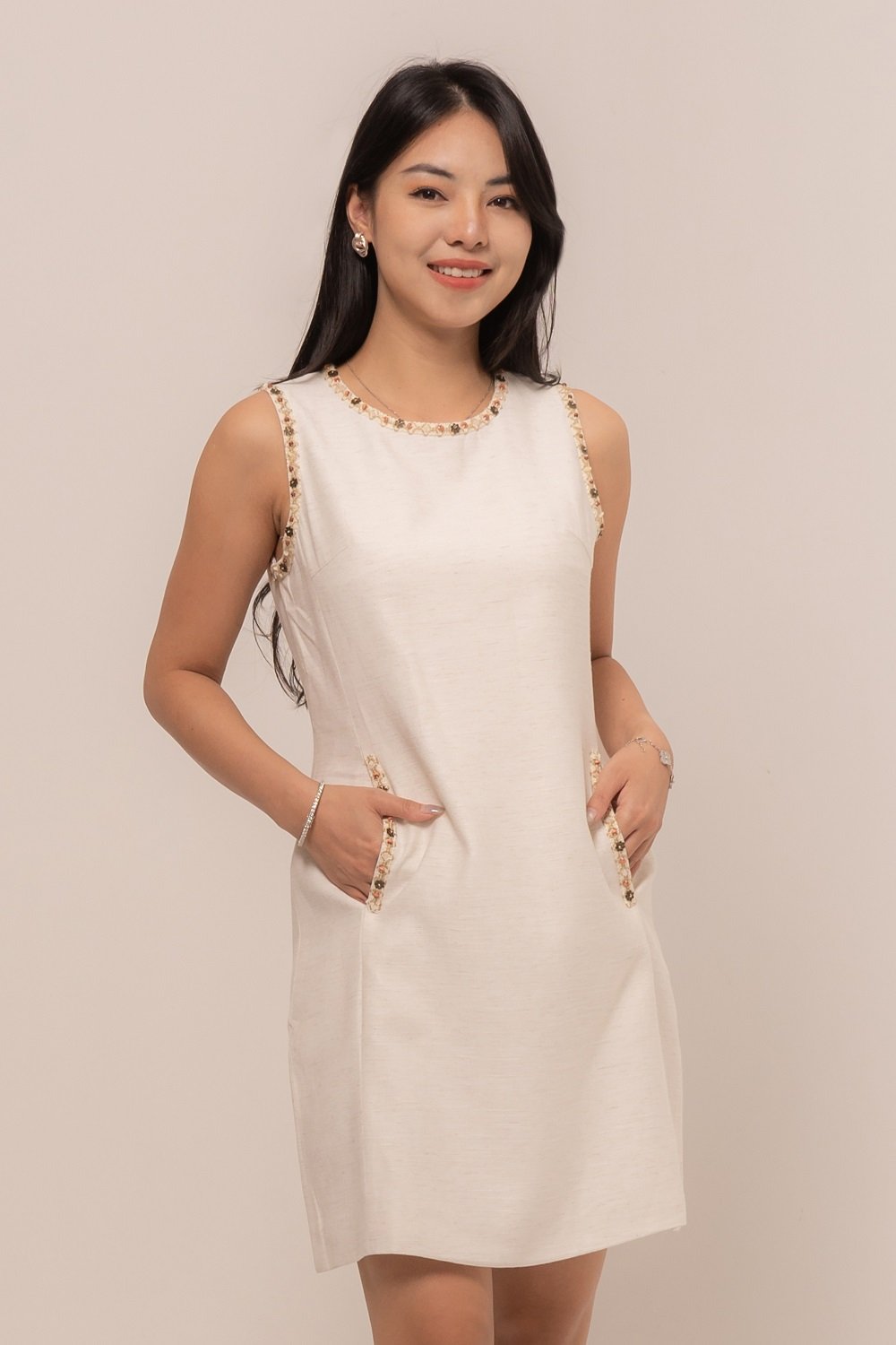 This Azure Dress is beautifully accented with tiny floral bead embellishments, adding a soft, feminine touch to your look.