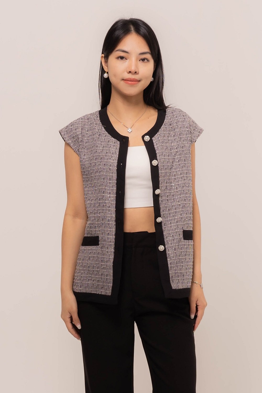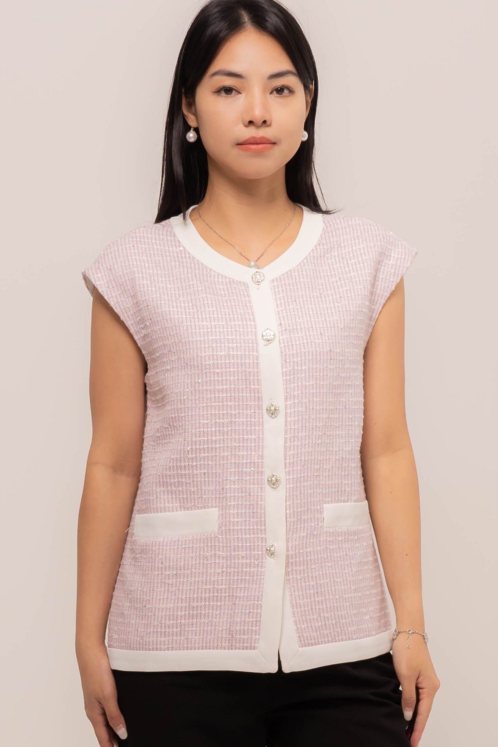 This Cytherea Tweed Top has a classic round neckline, finished with a front button loop, it’s ready to pair with high-waisted pants or skirts for effortless style!