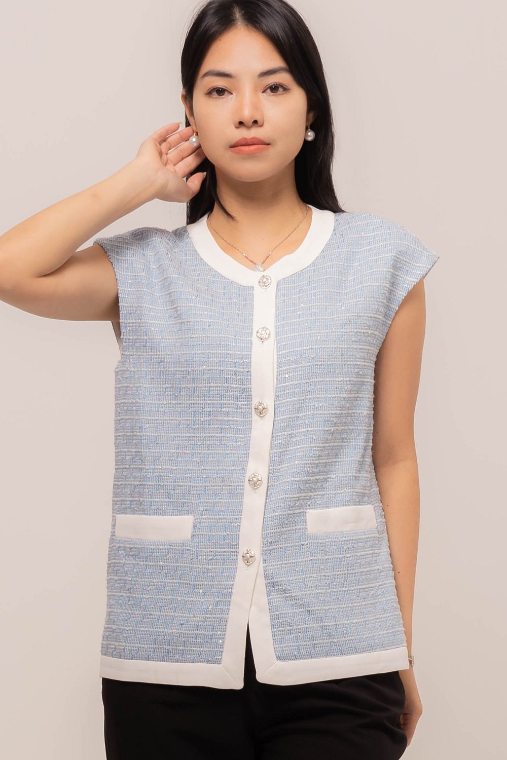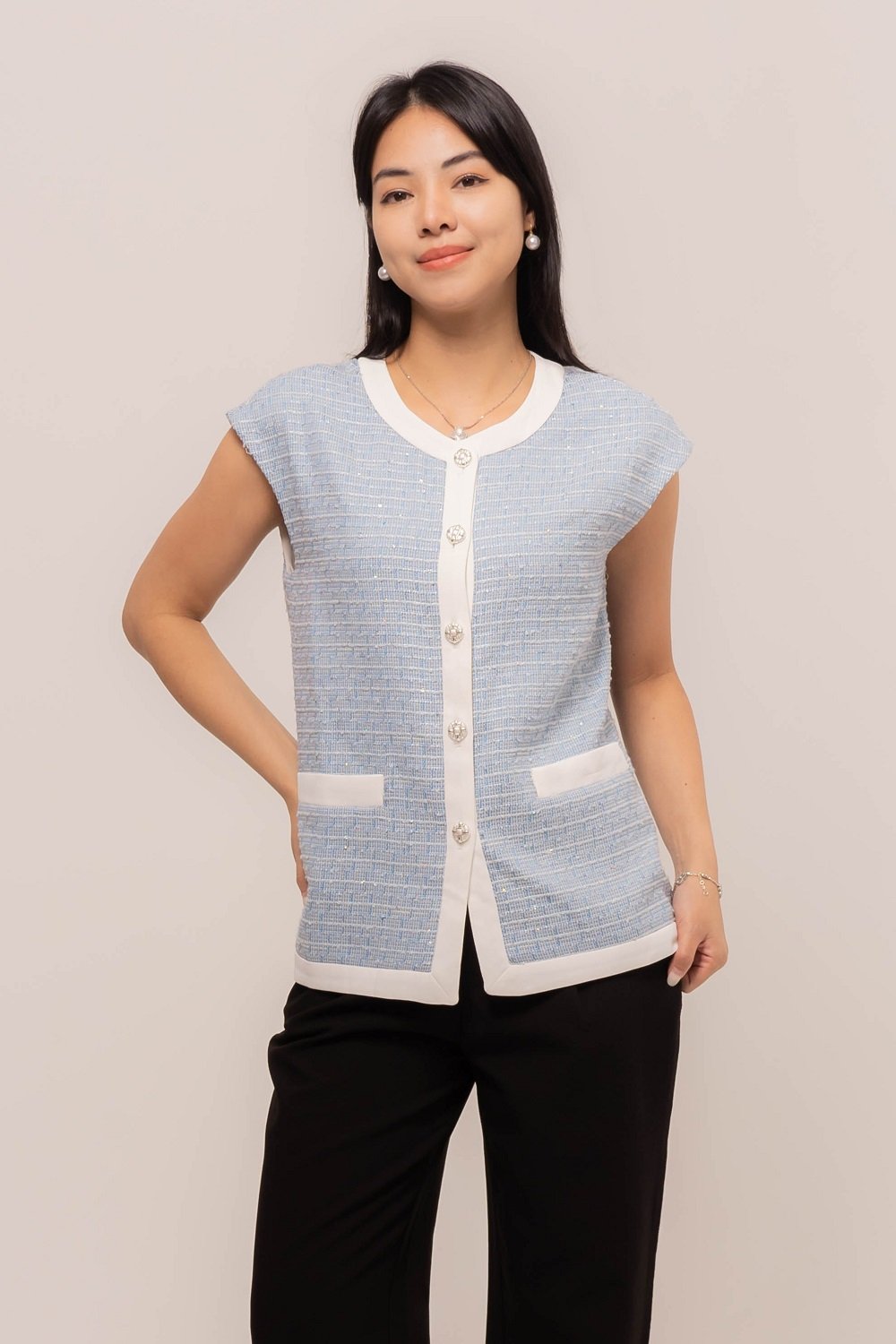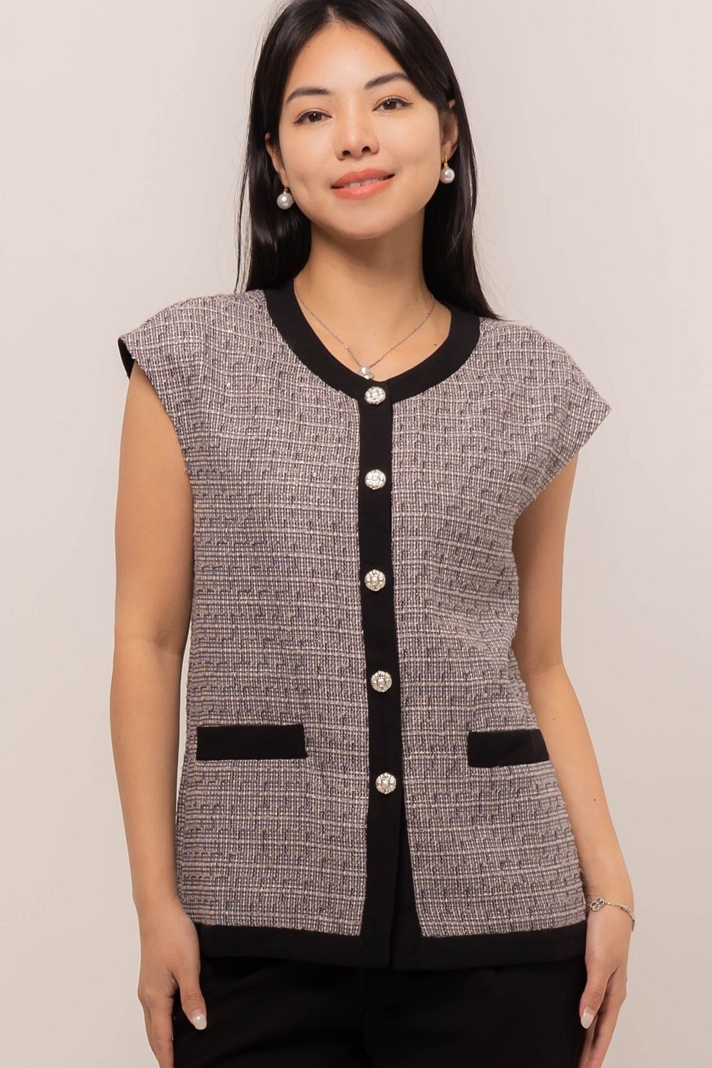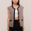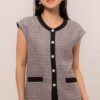 This Cytherea Tweed Top has a classic round neckline, finished with a front button loop, it’s ready to pair with high-waisted pants or skirts for effortless style!