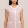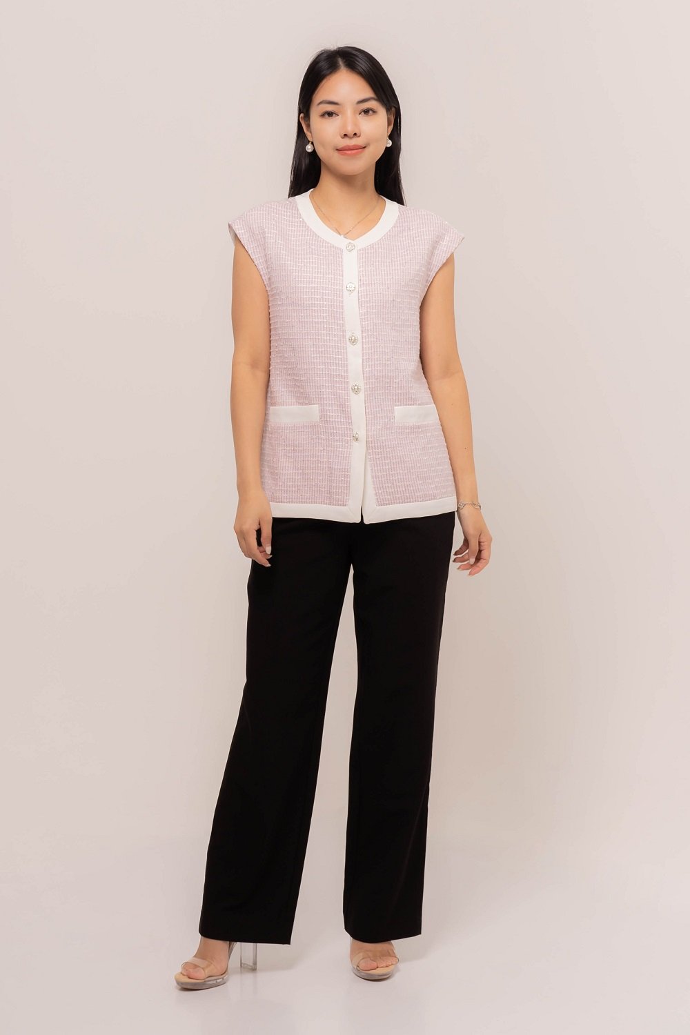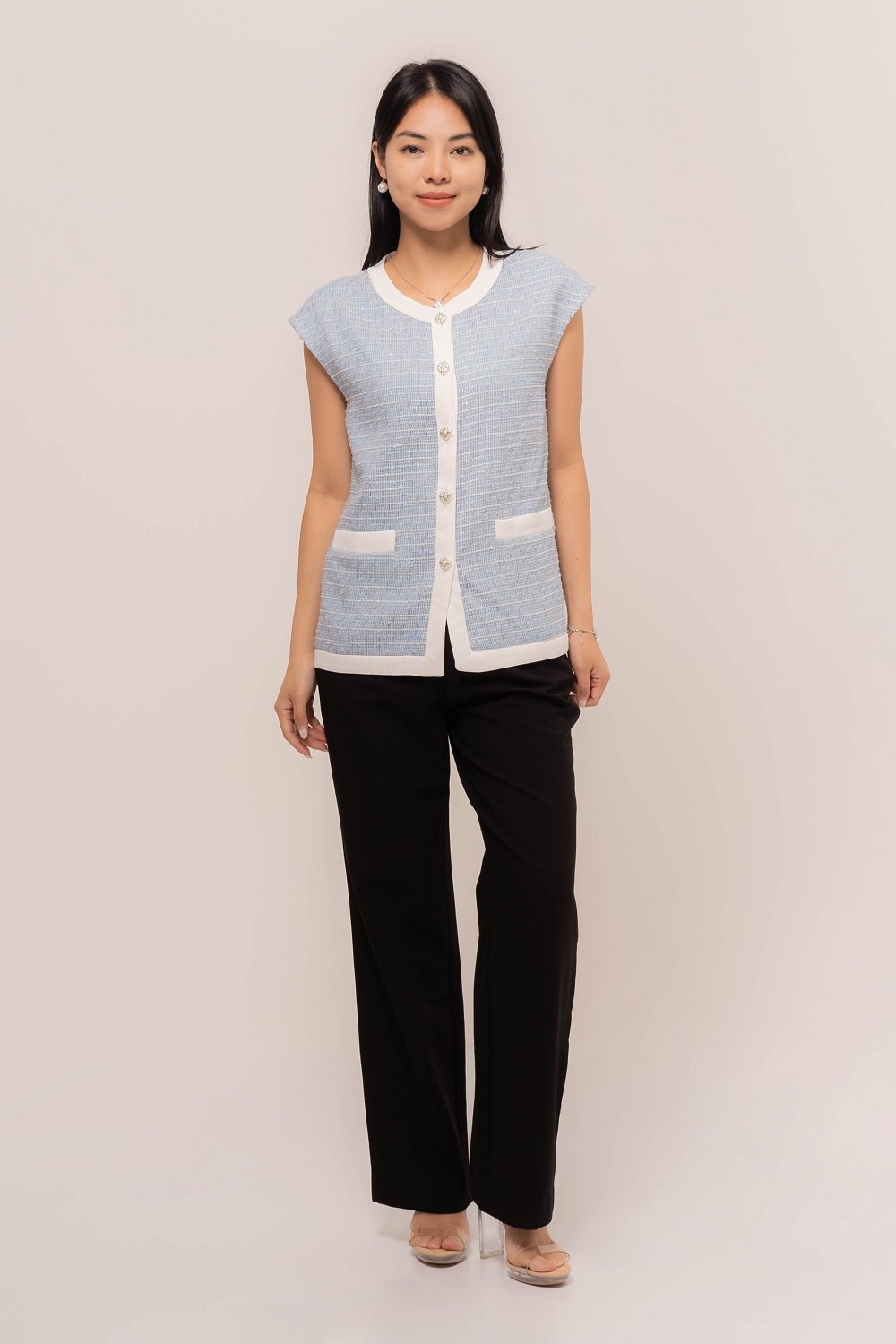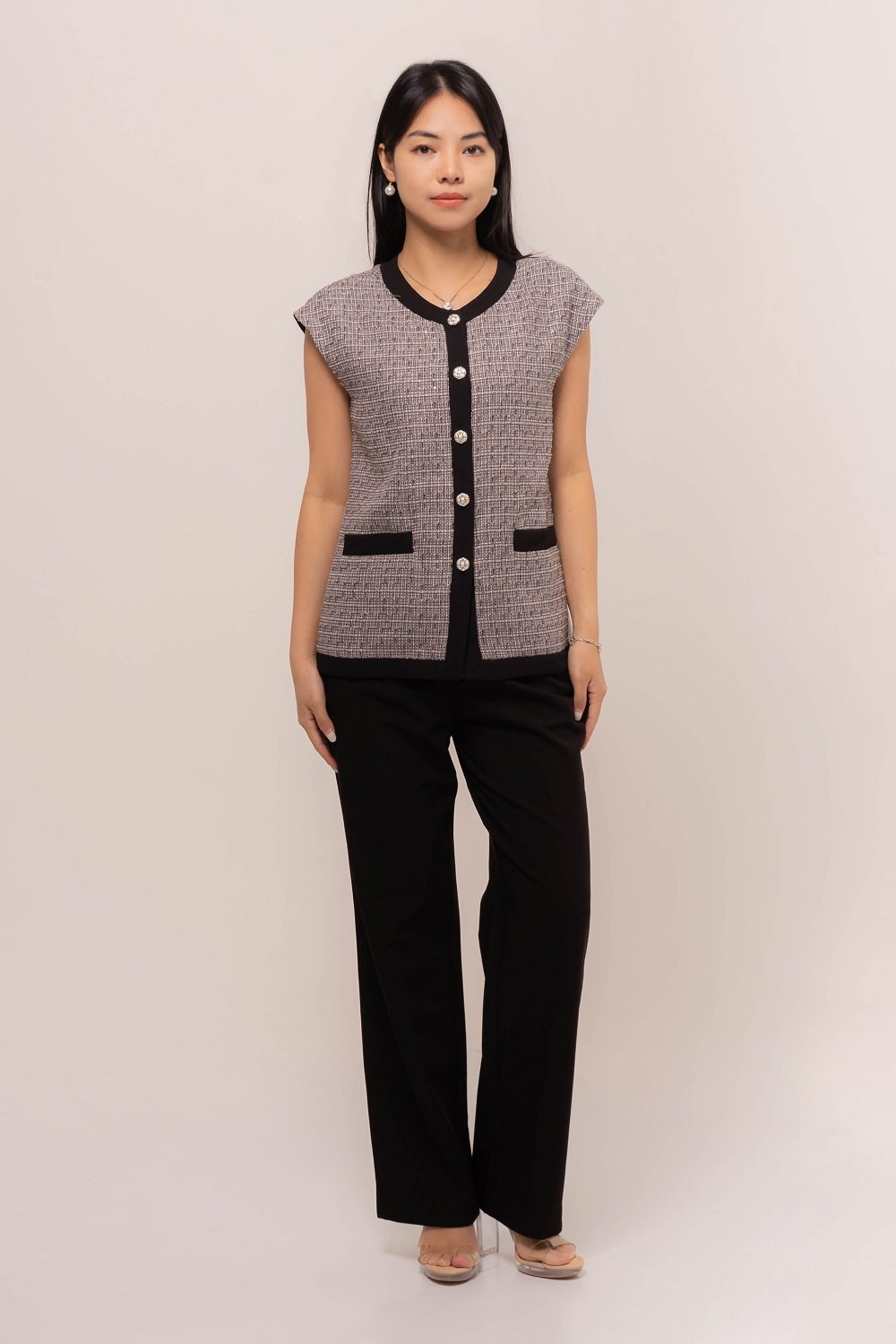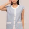 This Cytherea Tweed Top has a classic round neckline, finished with a front button loop, it’s ready to pair with high-waisted pants or skirts for effortless style!