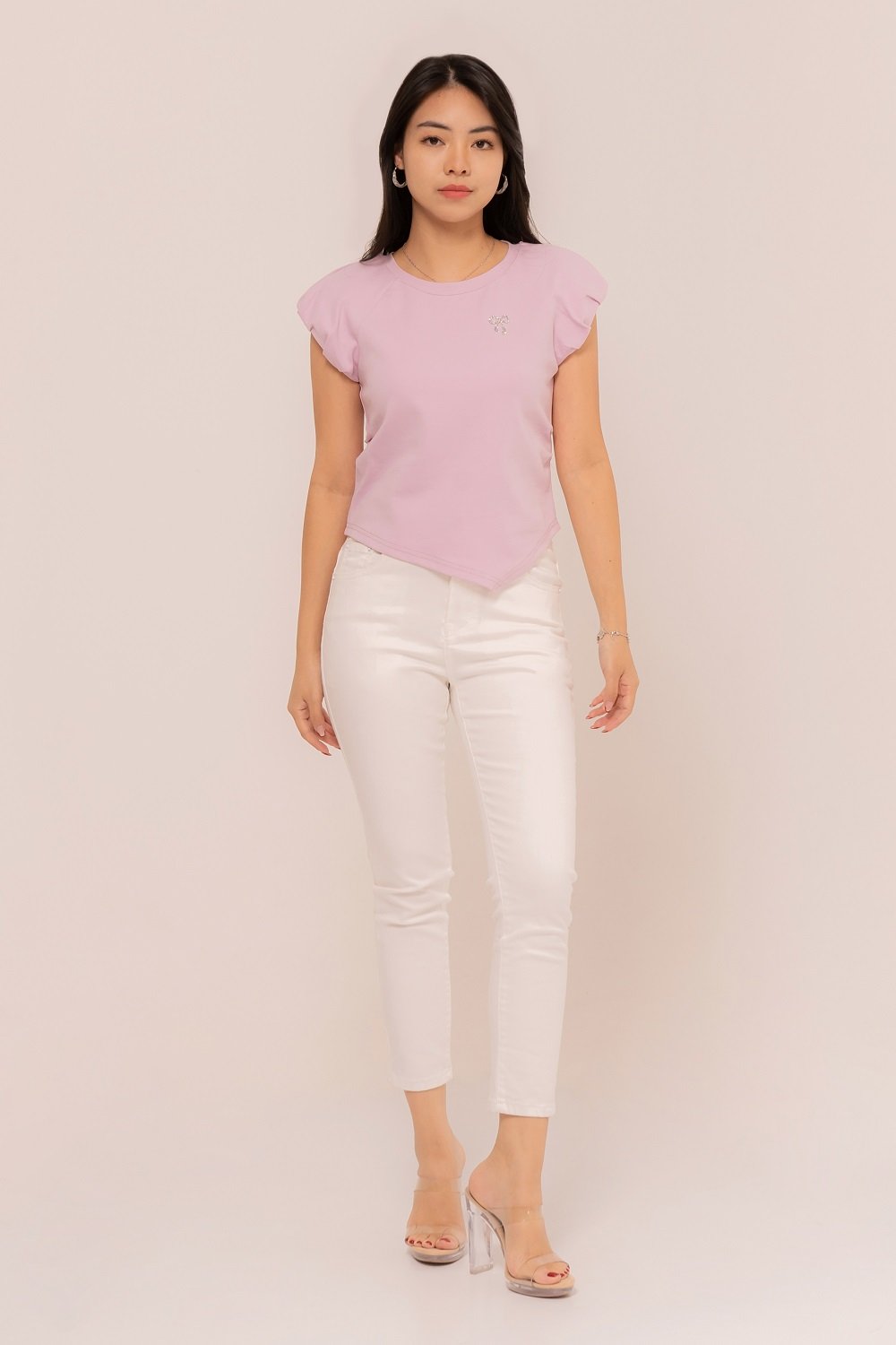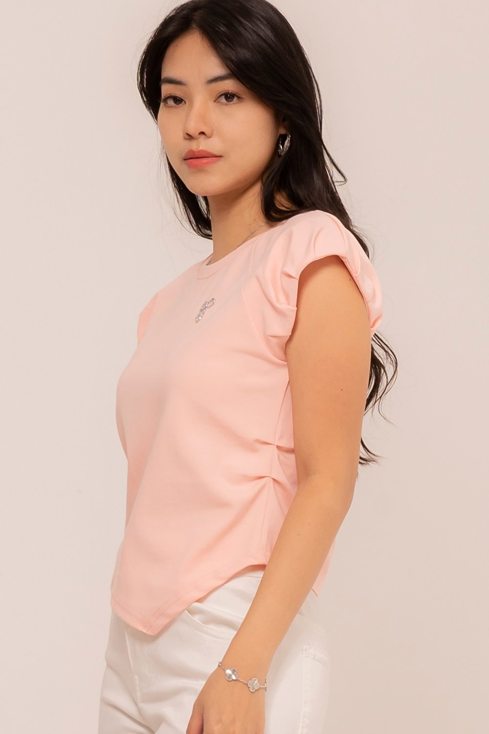 -Detail pleats pada pundak yang cantik dengan slit pada asymmetrical