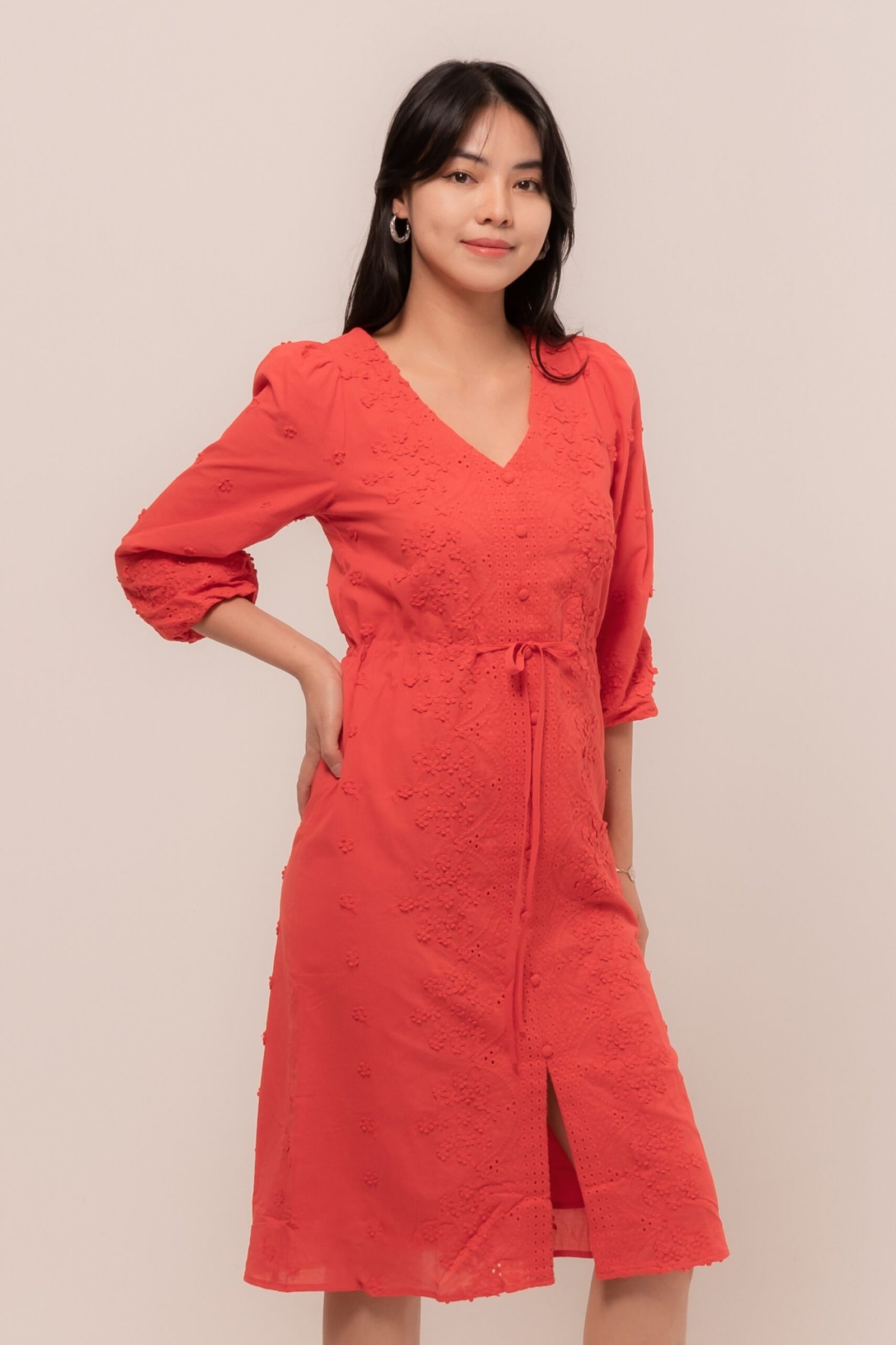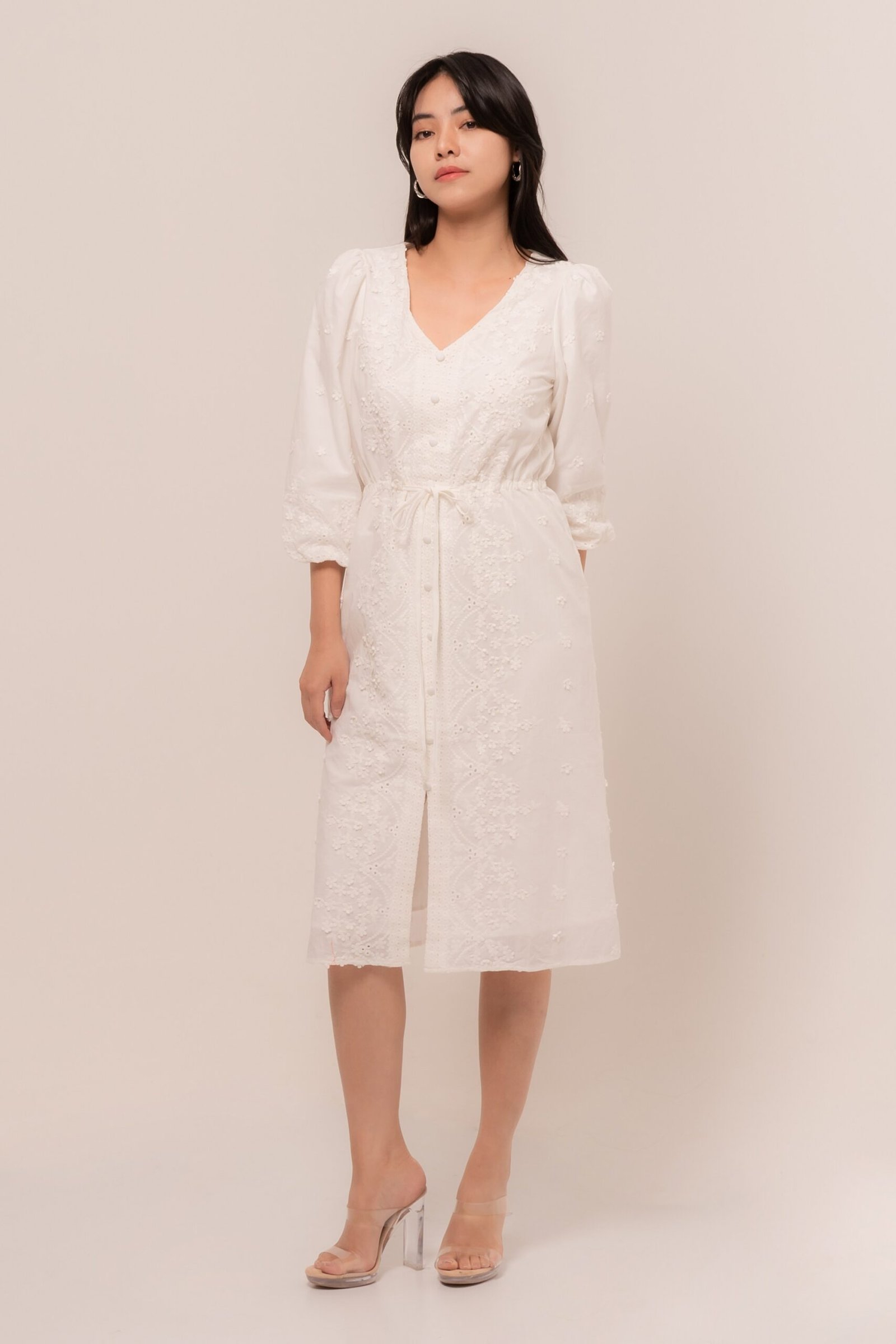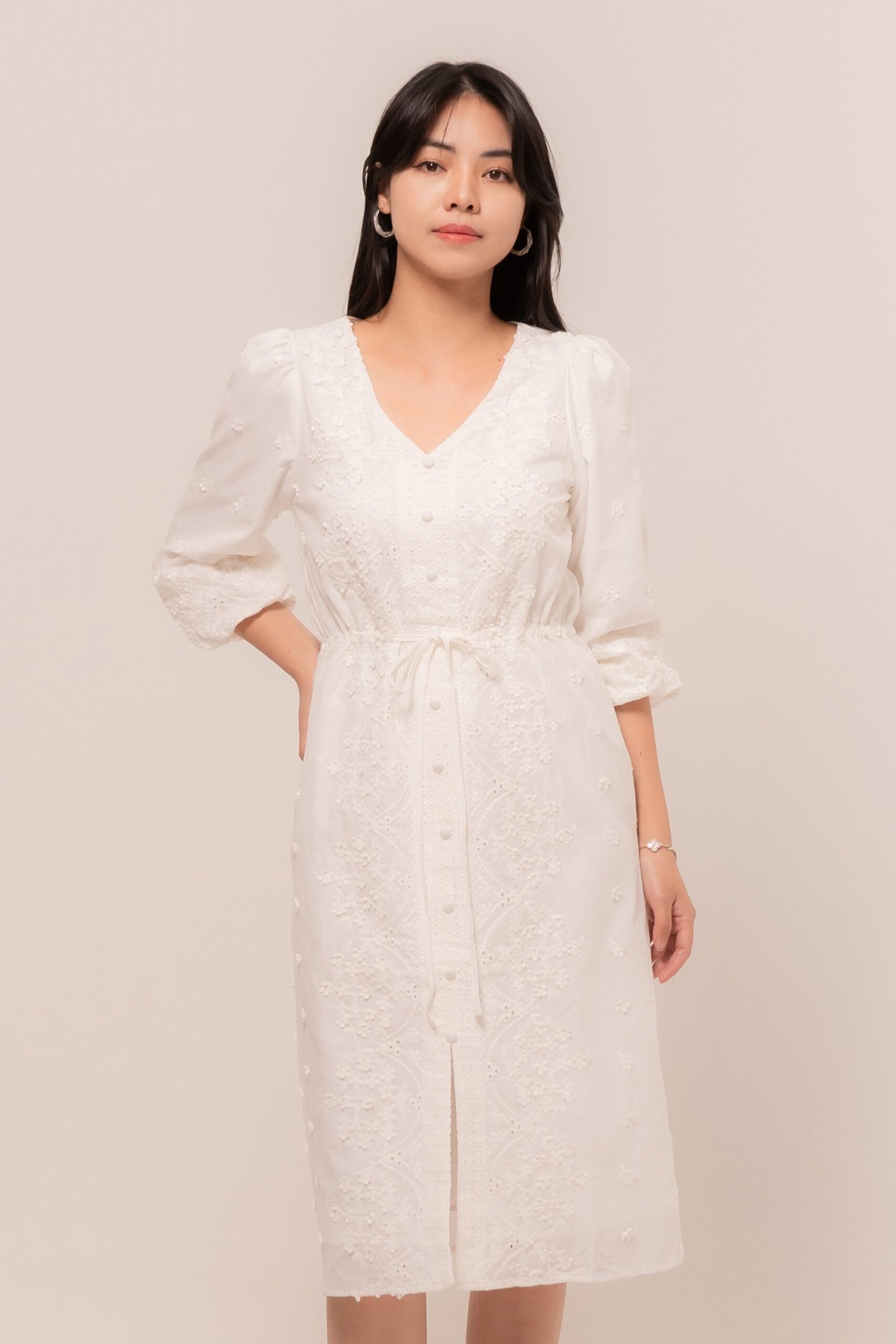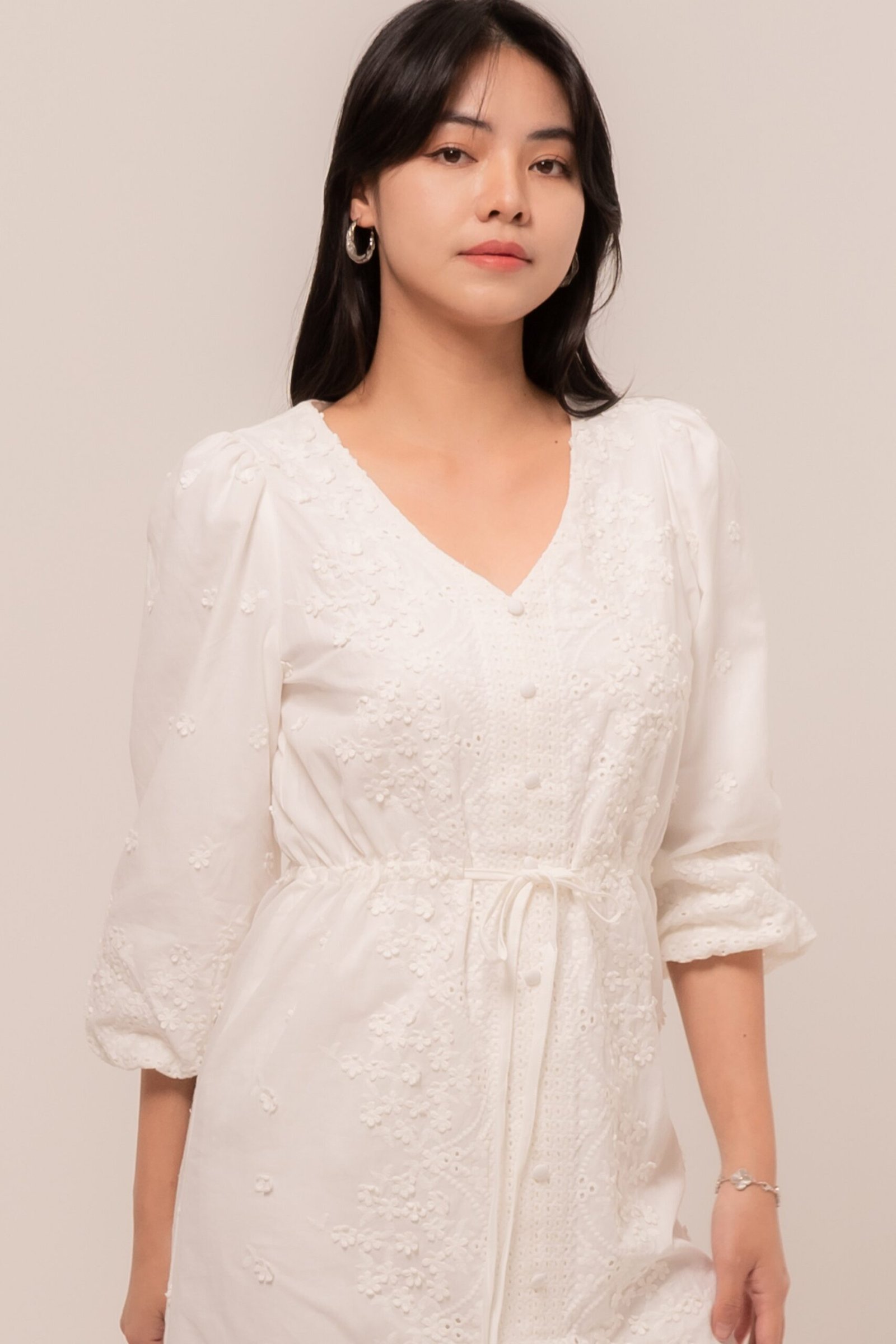 Slip into the serene beauty of our Fioren Dress with beautiful flower embroidery and anglaise
