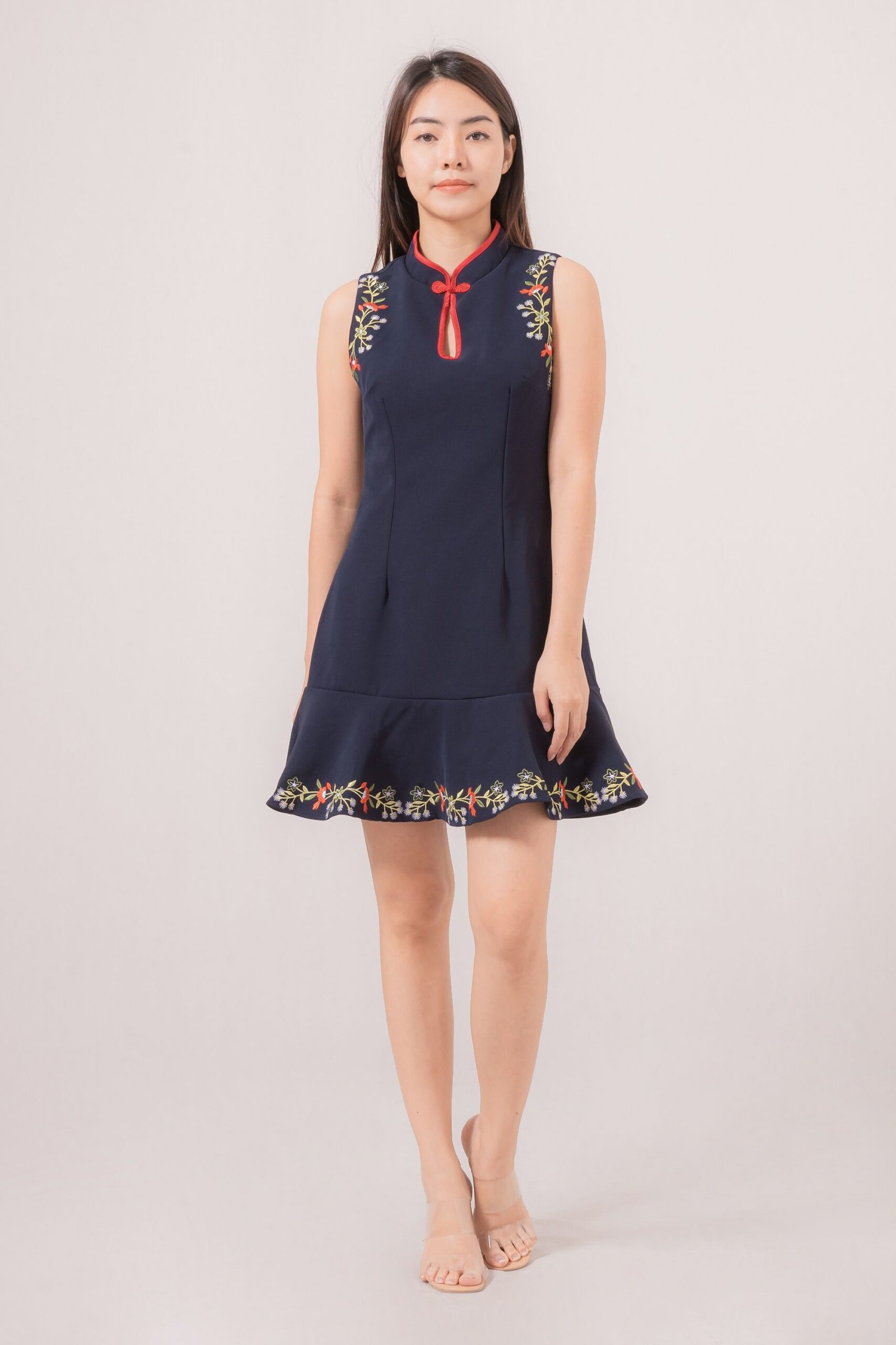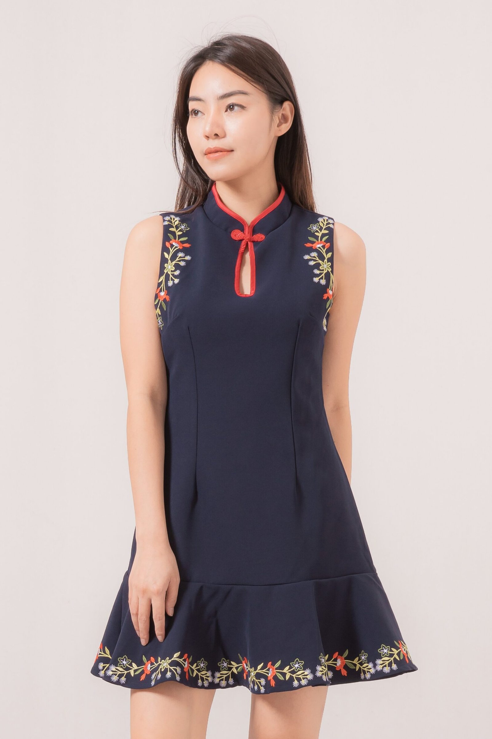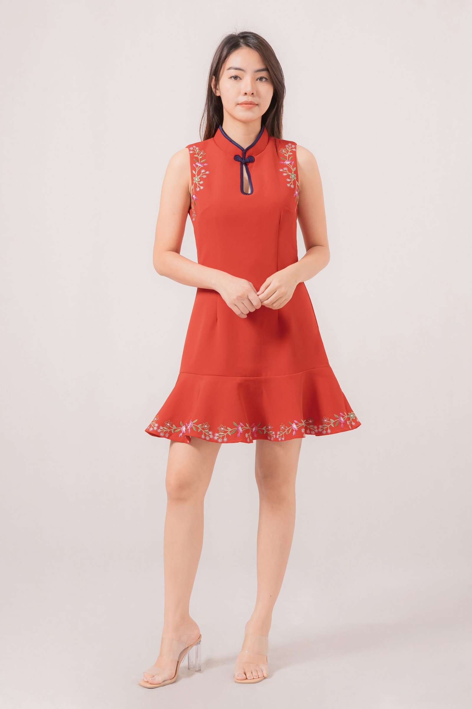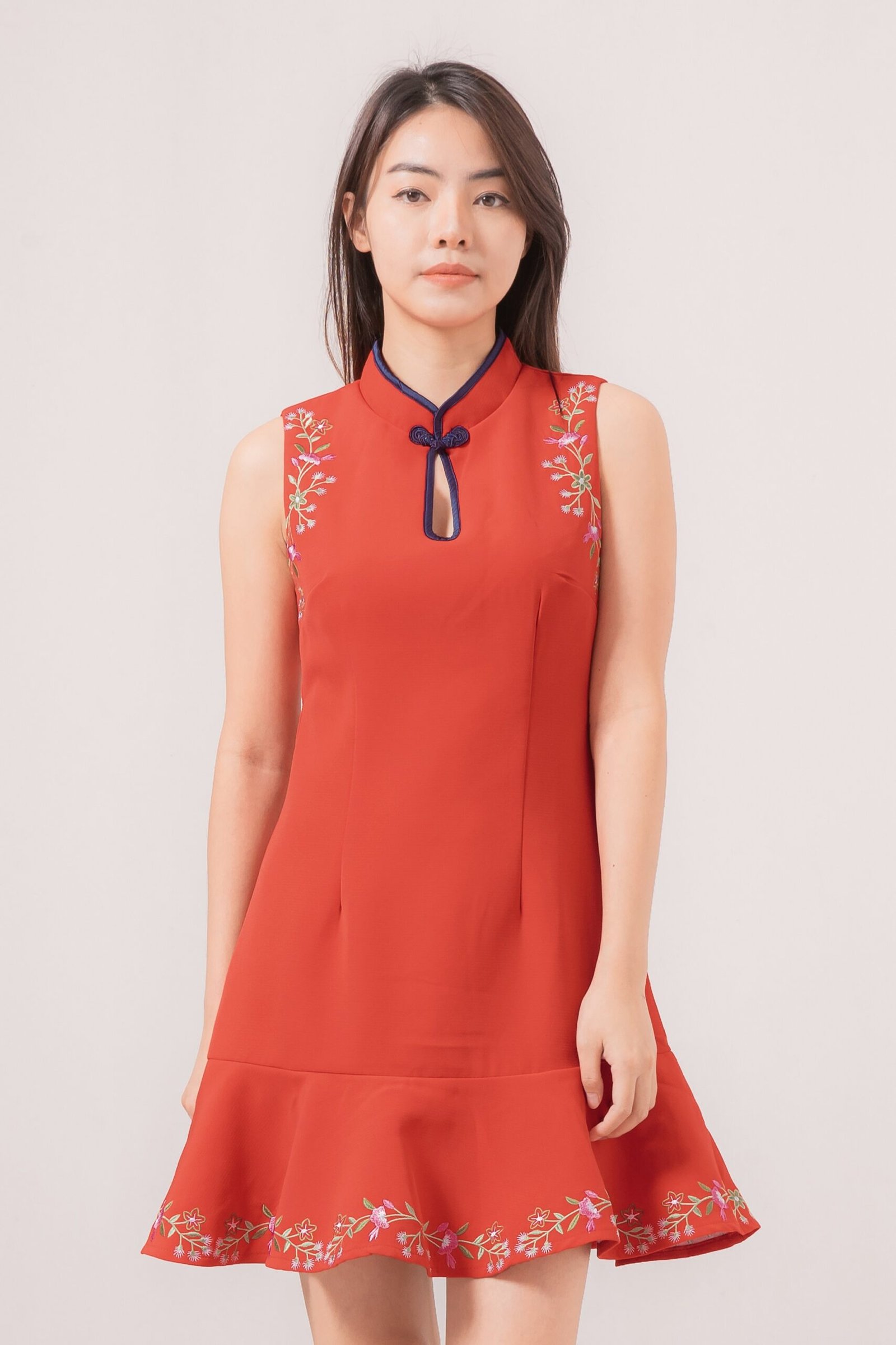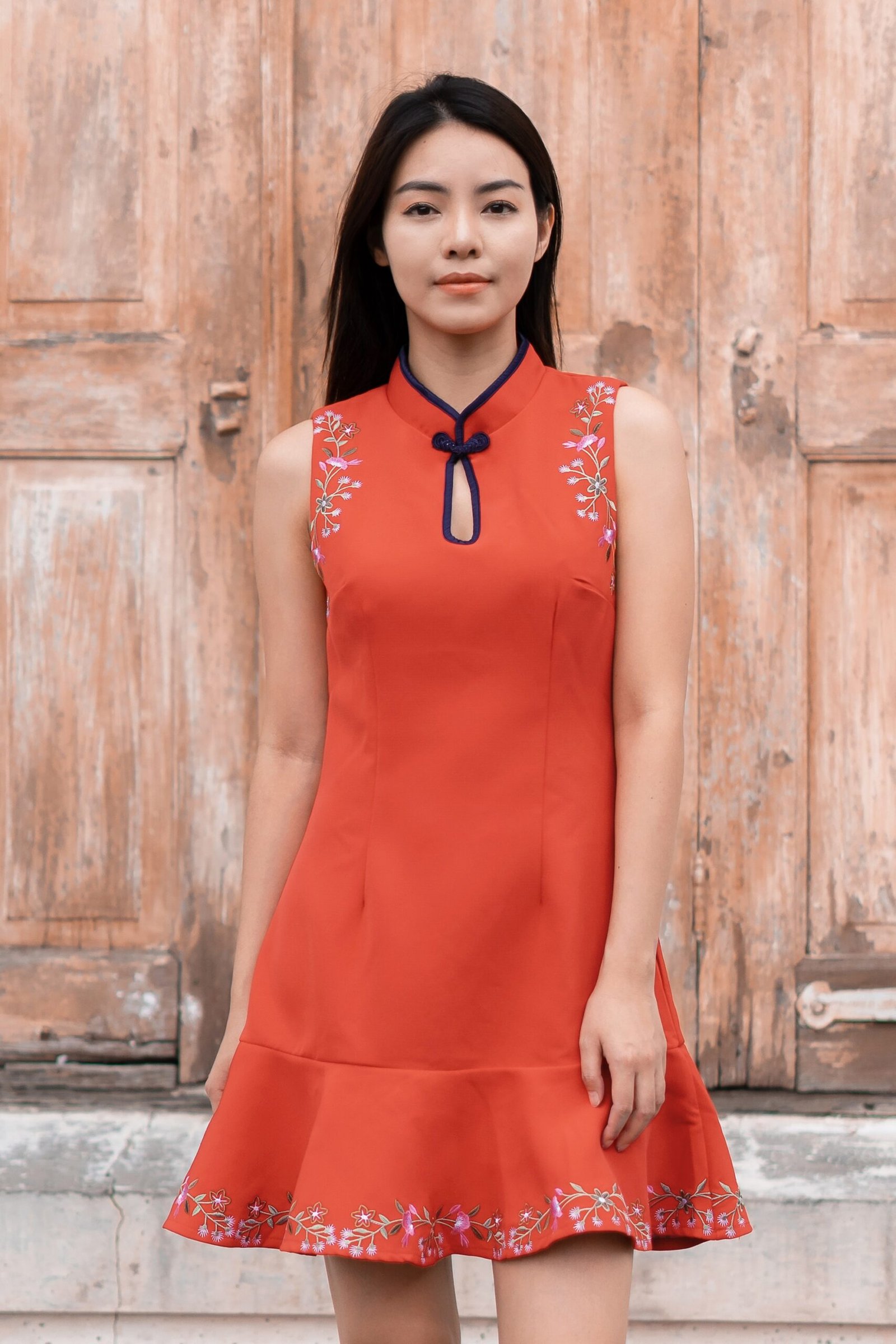 Chinese New Year outfit crafted from a flower embroidered material, this sleeveless a-line dress is perfect for the occasion