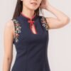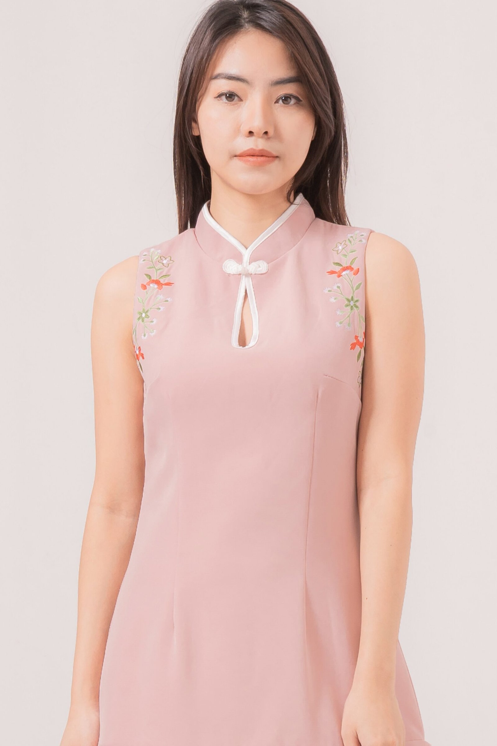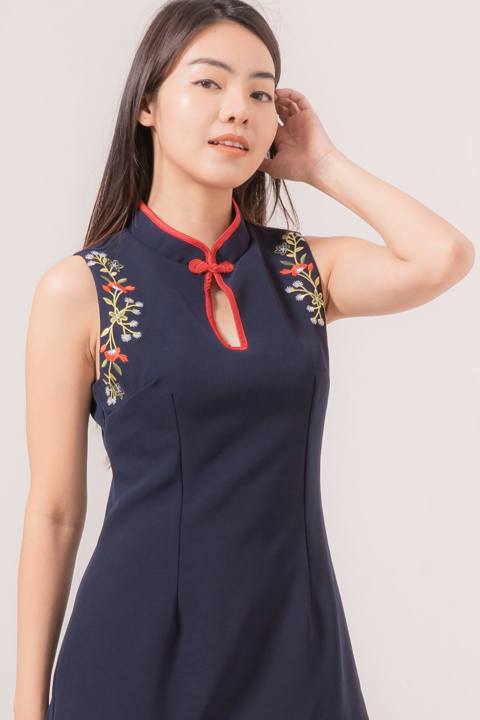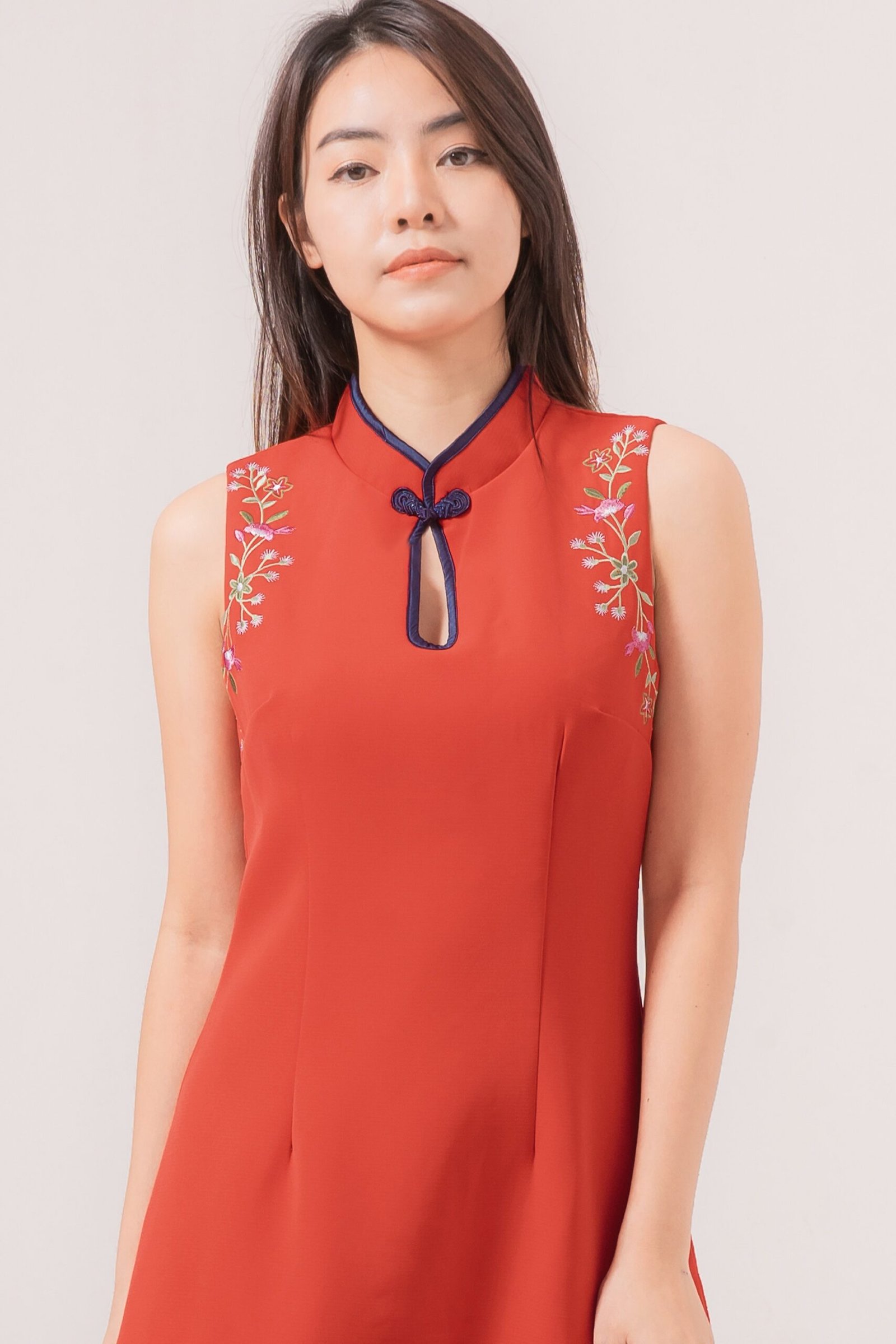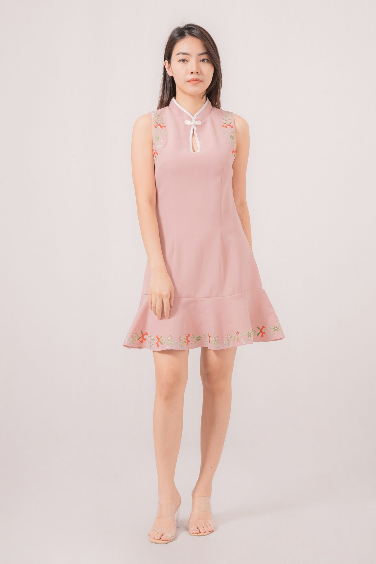 Chinese New Year outfit crafted from a flower embroidered material, this sleeveless a-line dress is perfect for the occasion