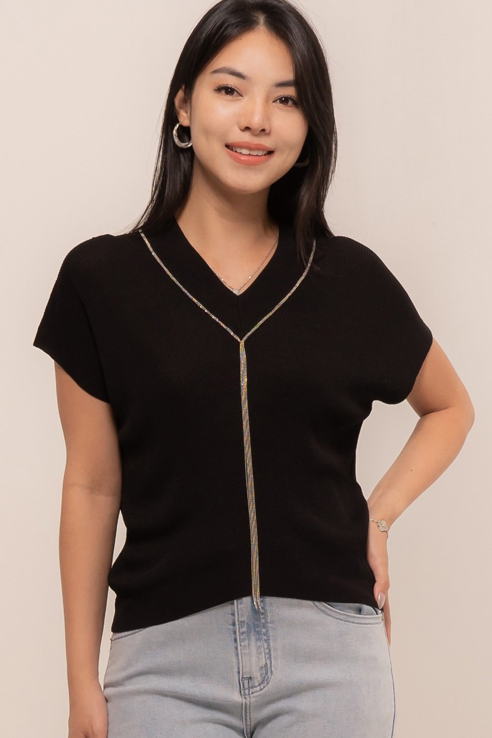 -V neck dengan manik strip yang menawan