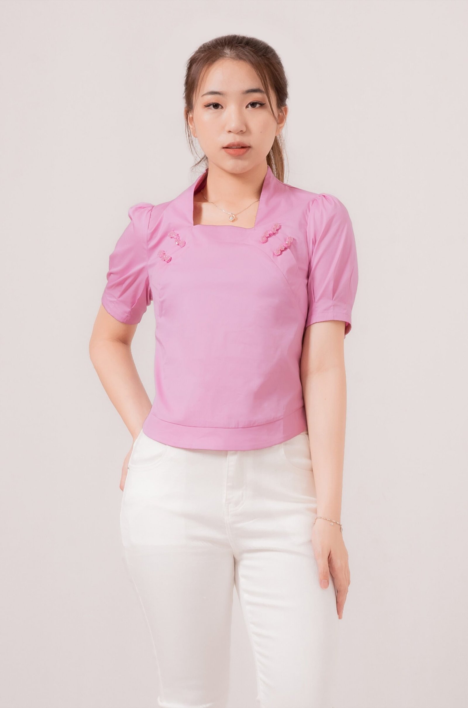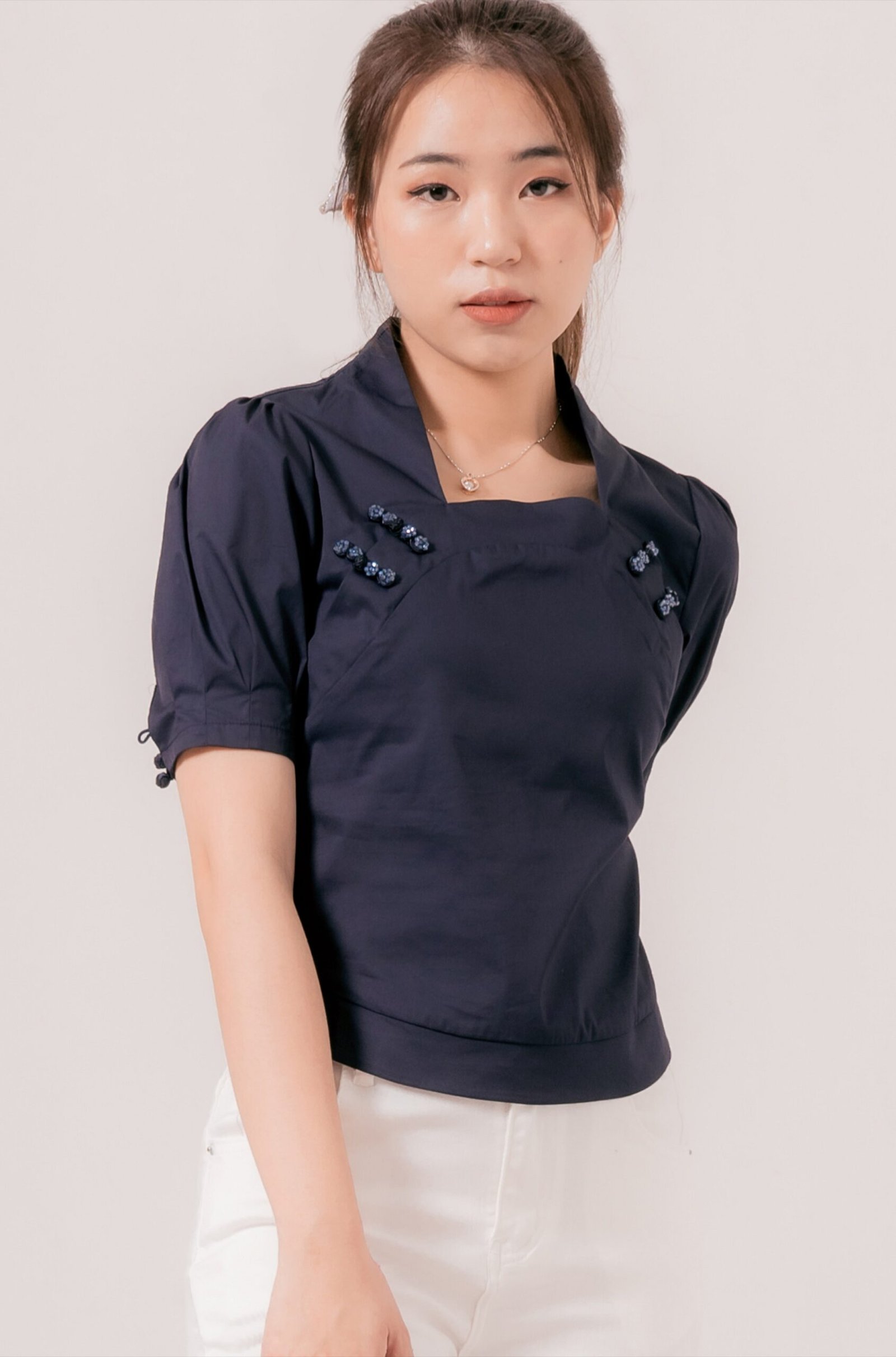-Kancing shanghai yang menawan pada bagian depan sebagai variasi