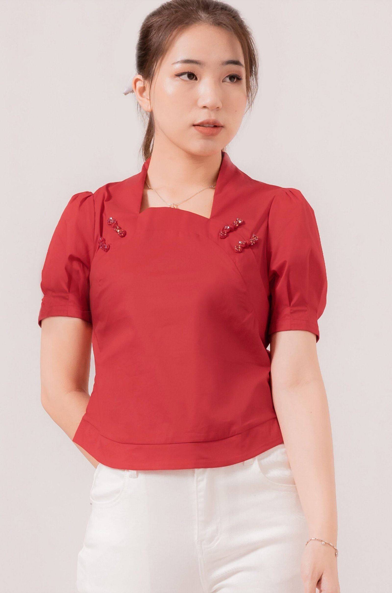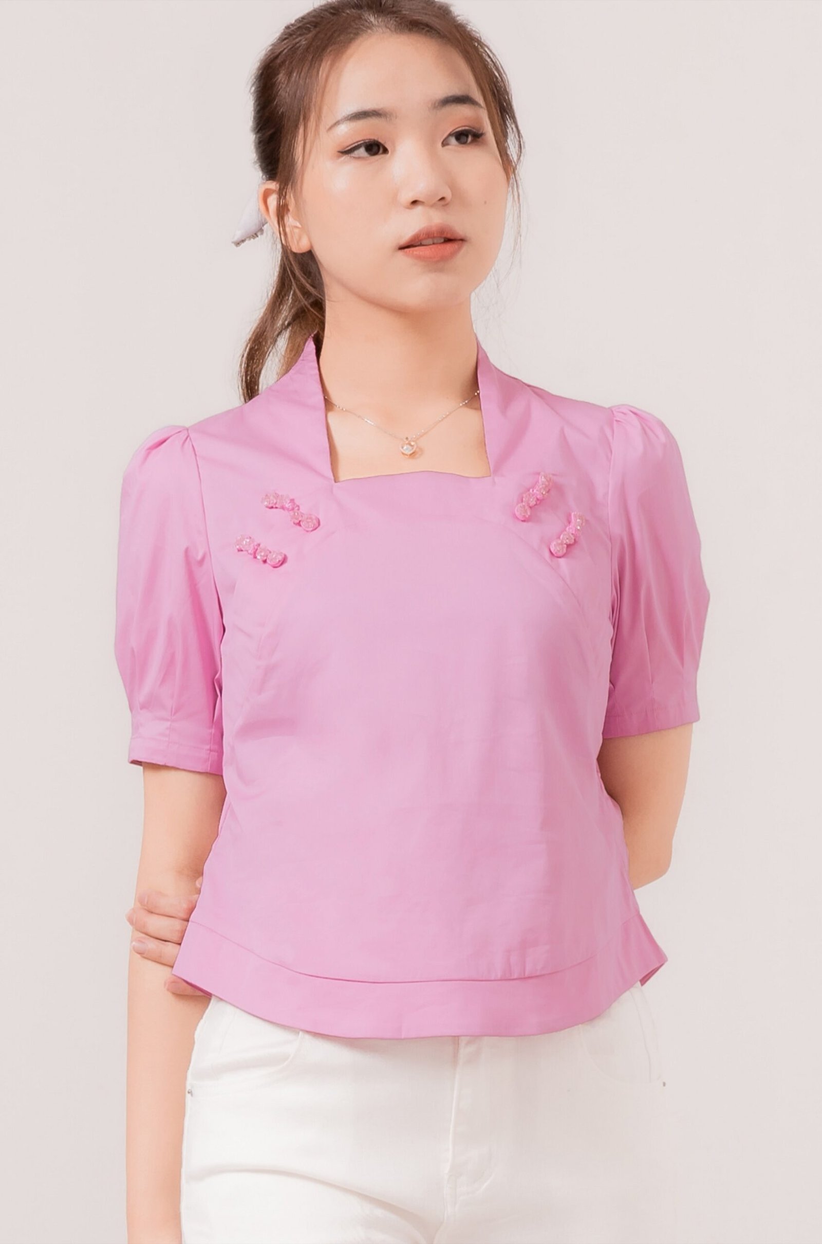 -Lengan puff sleeves menawan dengan kancing shanghai fungsional pada lengan