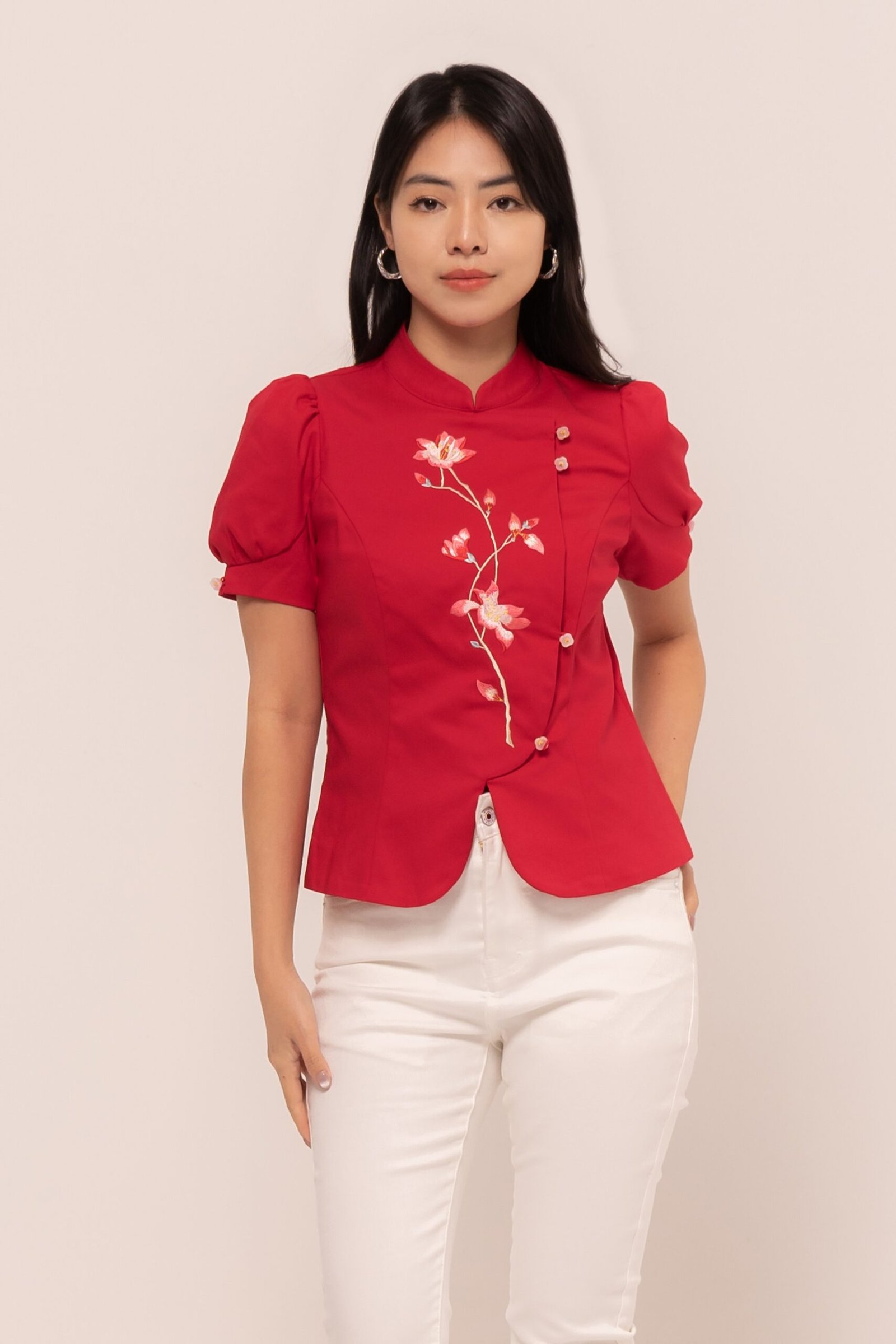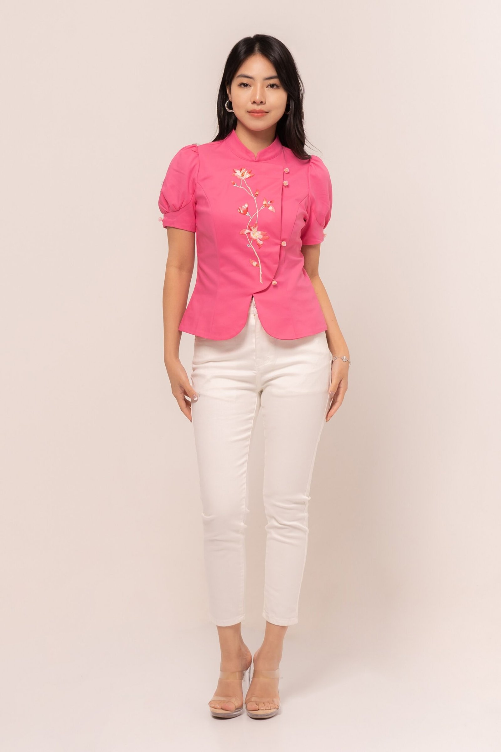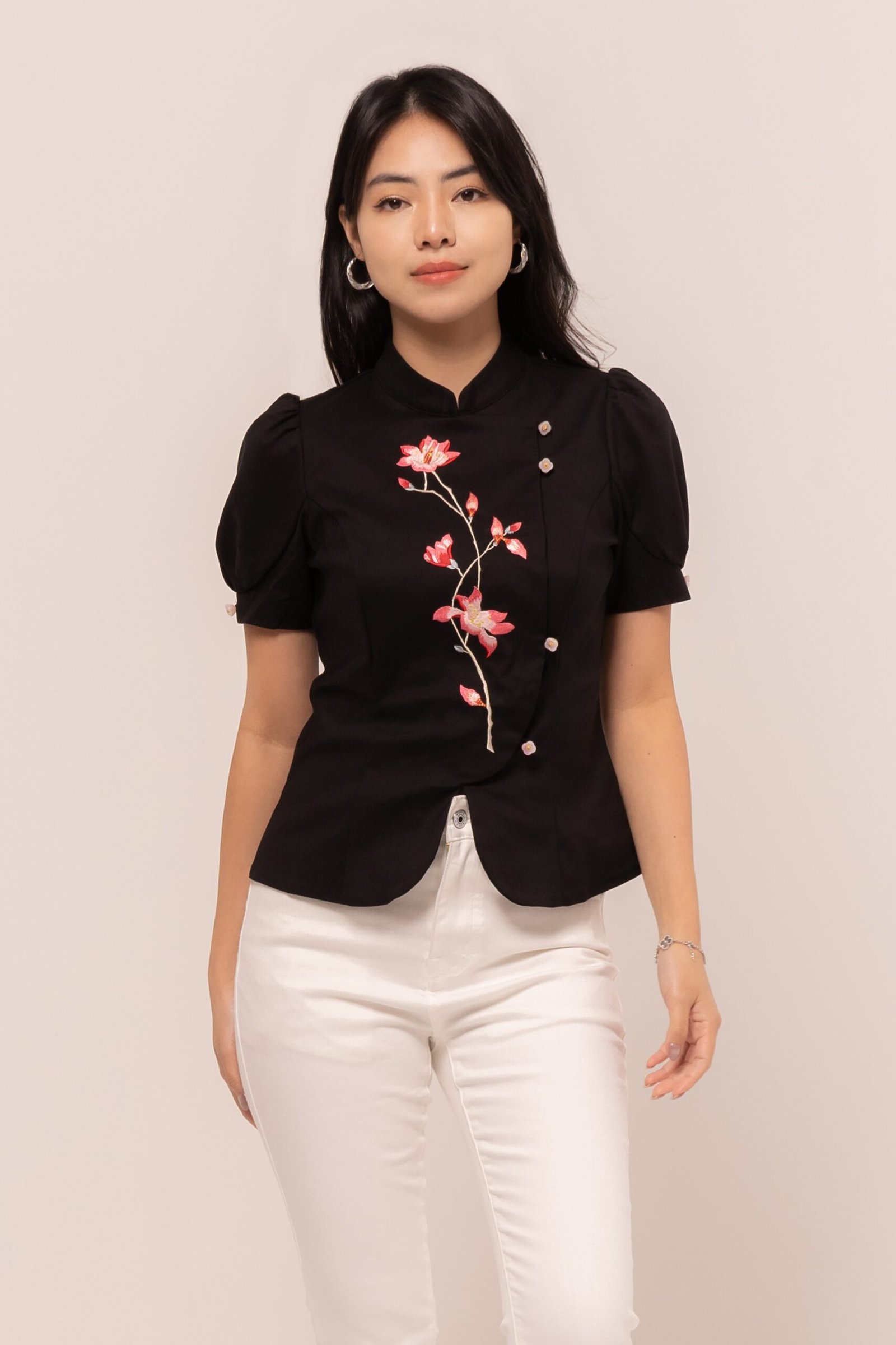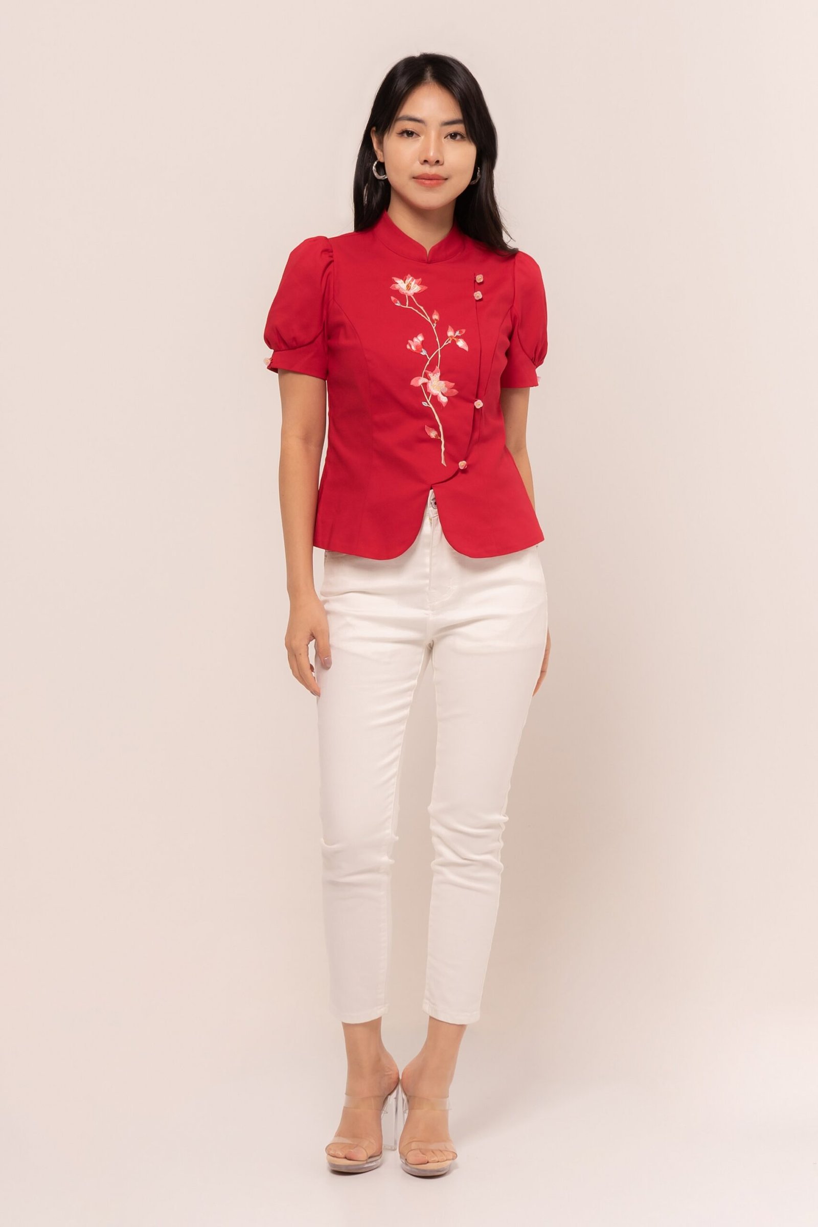 Dress for prosperity in our MingZhu Flower Embroidery Top, where MingZhu represents the blossoming of a new chapter filled with joy and prosperity