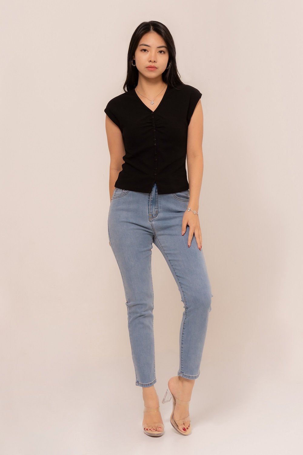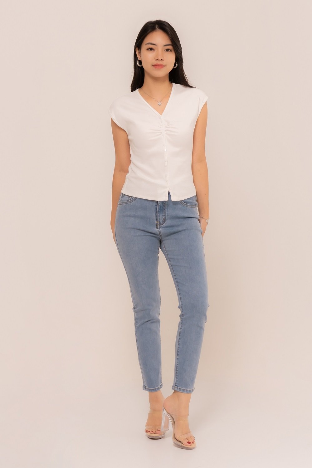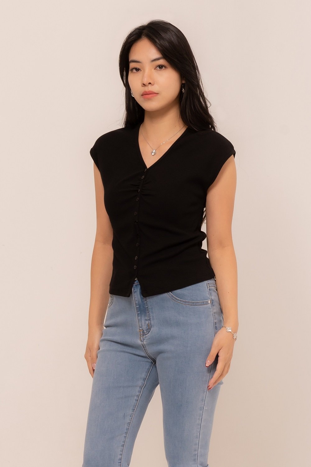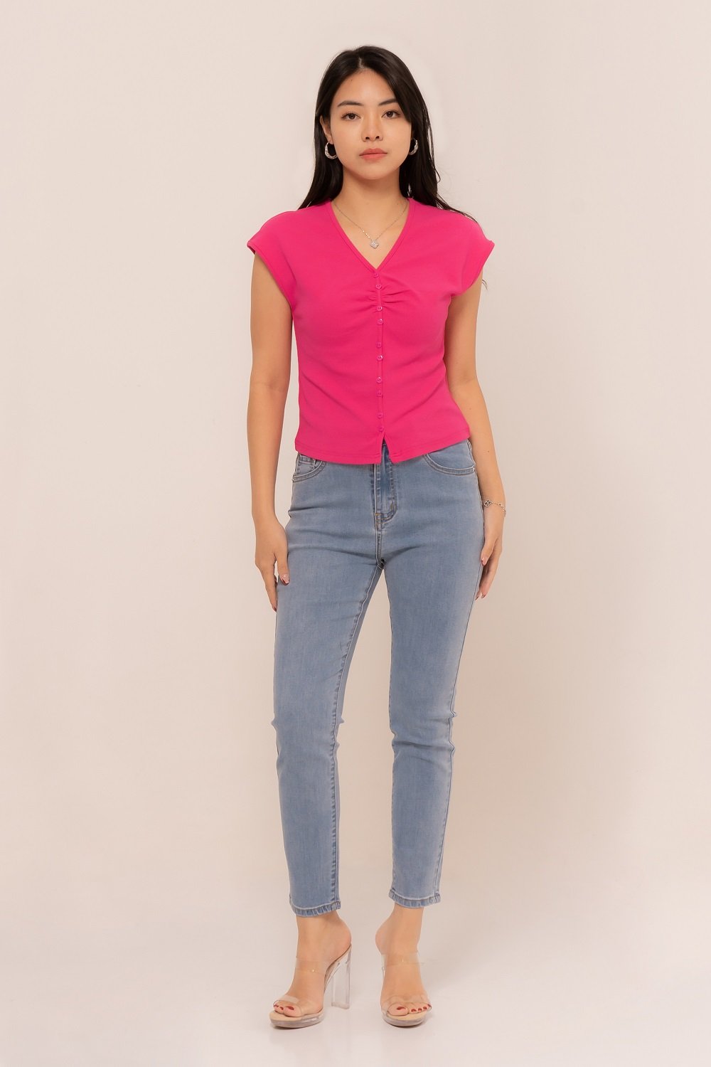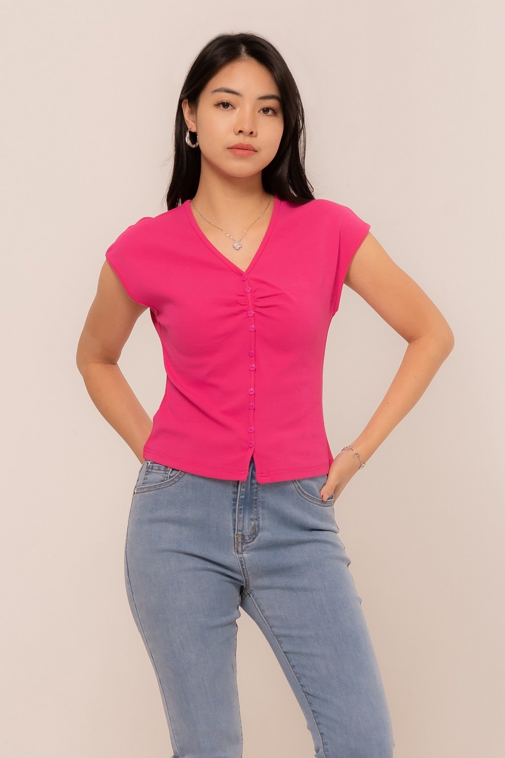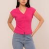 -Kancing depan variasi dengan ruched yang manis pada bagian depan