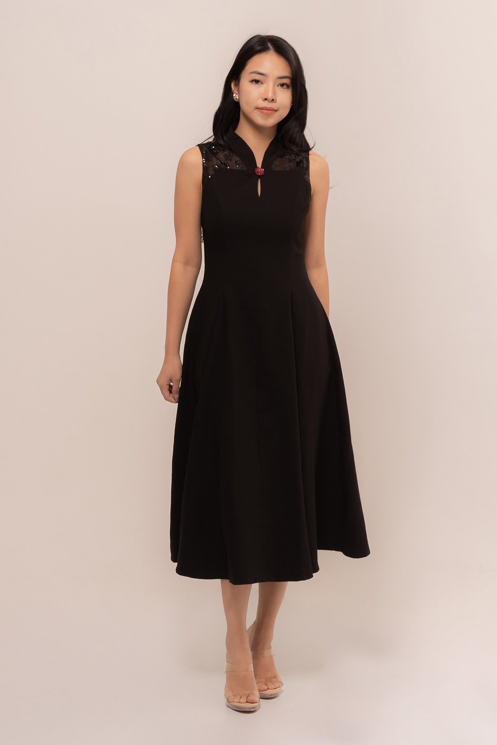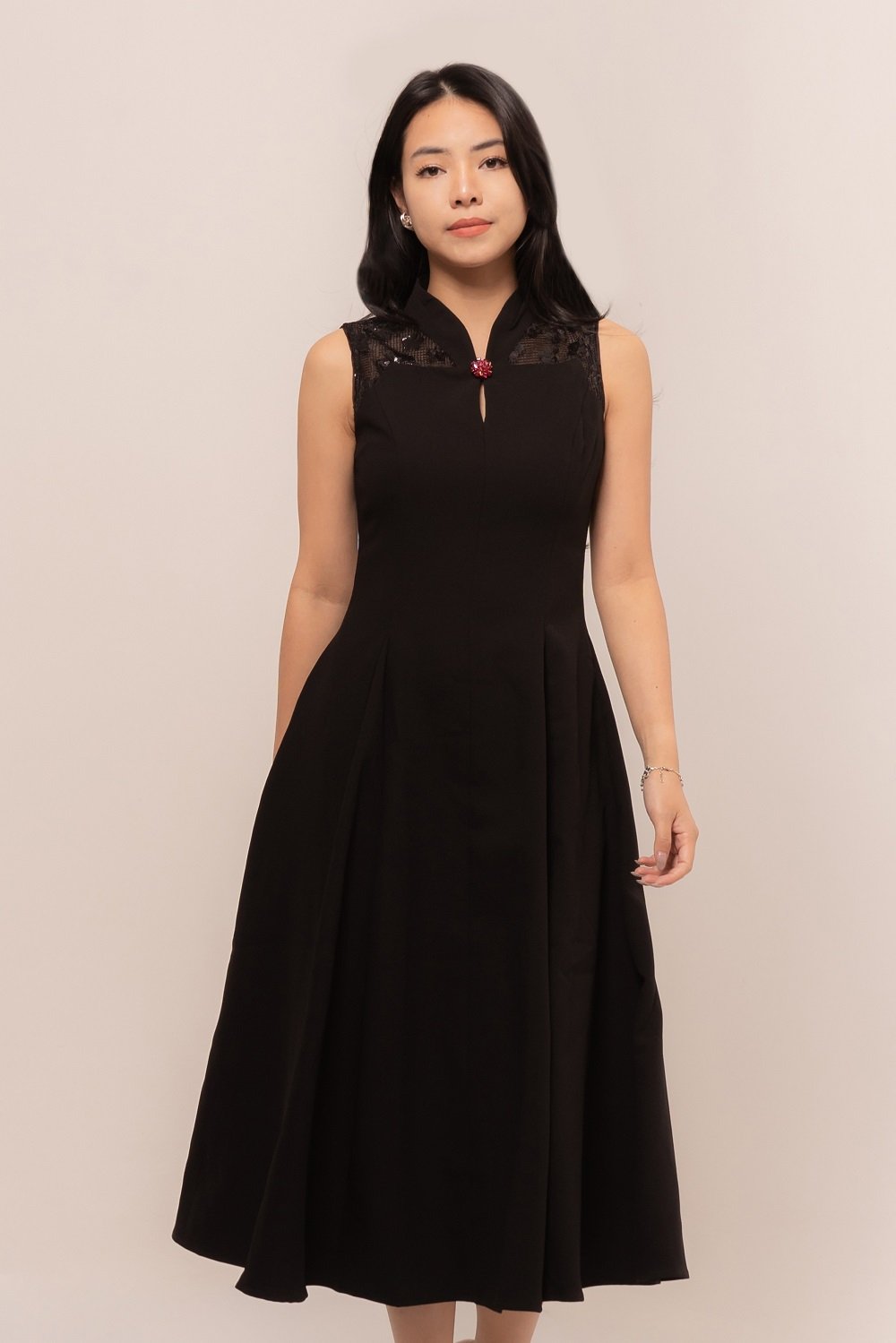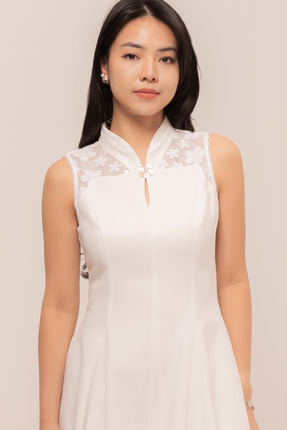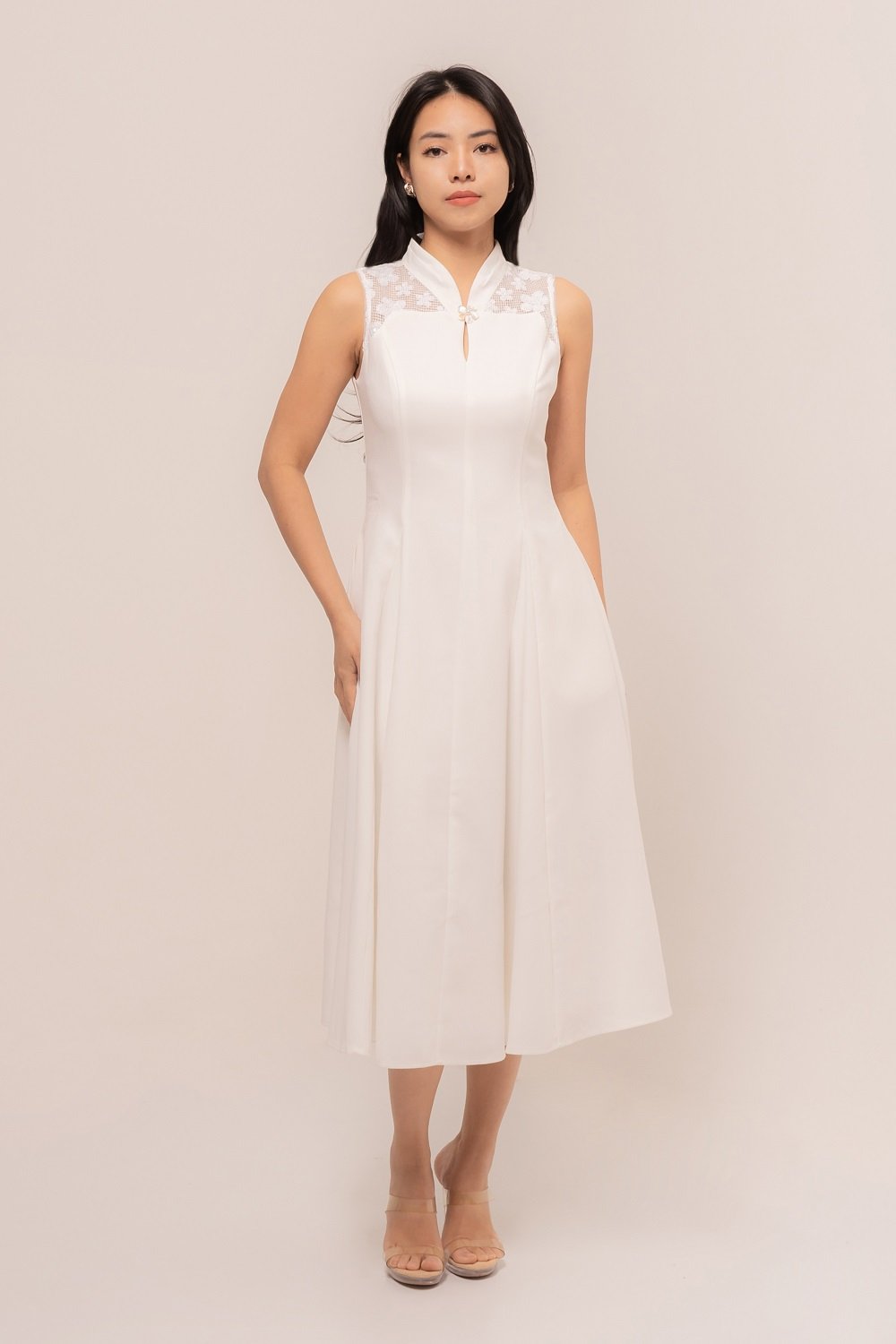 Effortlessly in this stunning Natalie Dress. Designed with a flattering A-line silhouette, delicate lace accents, and a graceful mandarin collar, it blends modern charm with timeless sophistication.