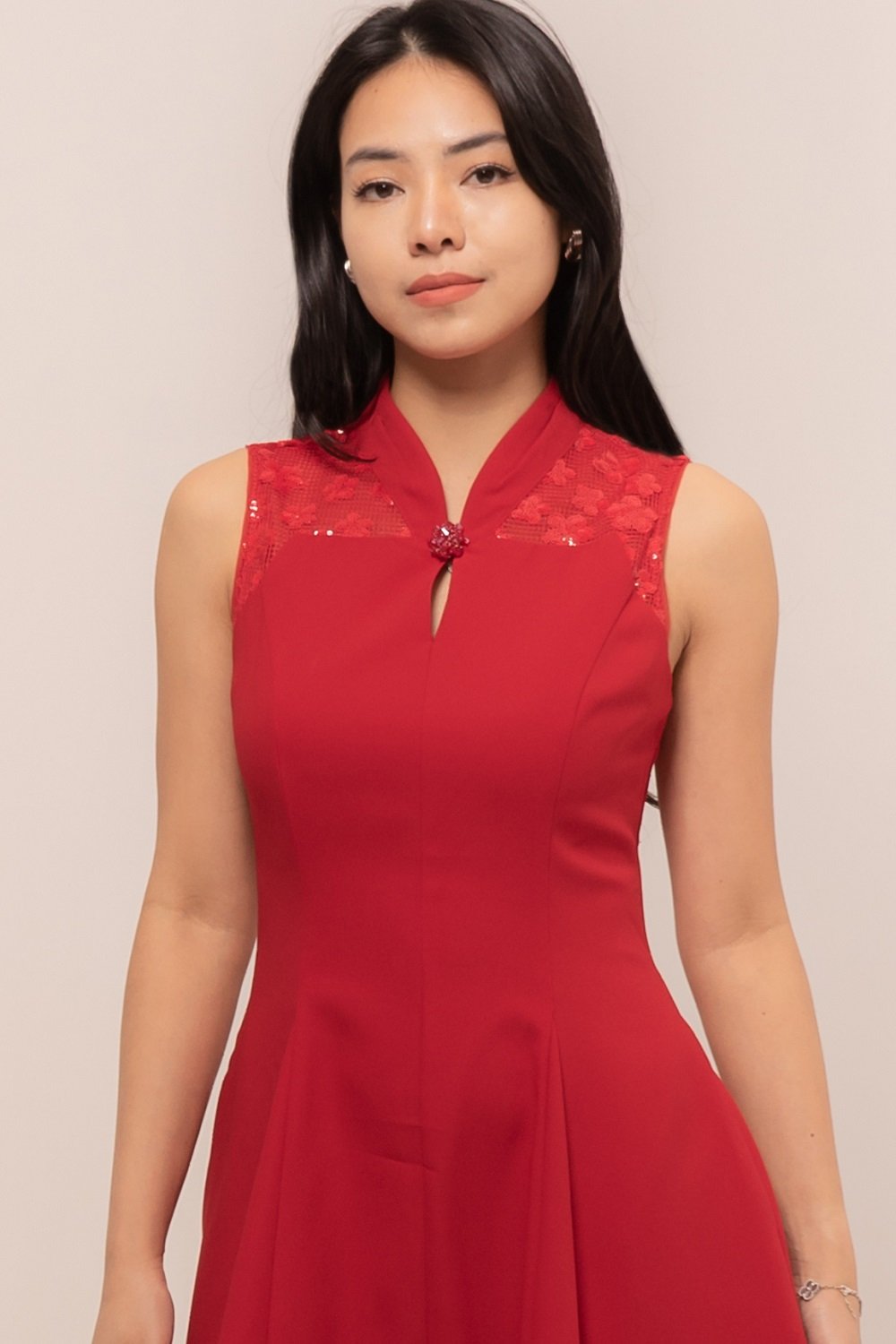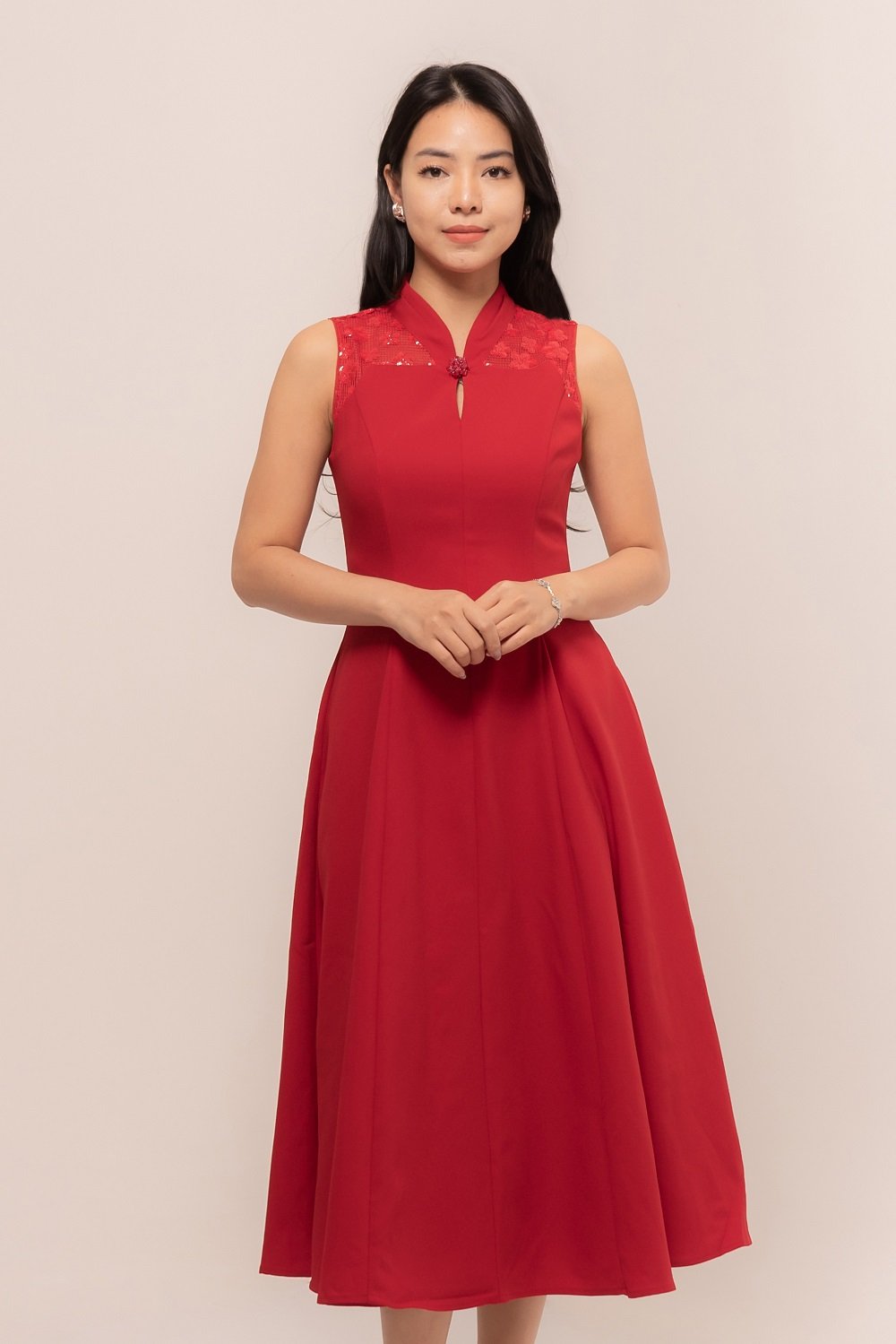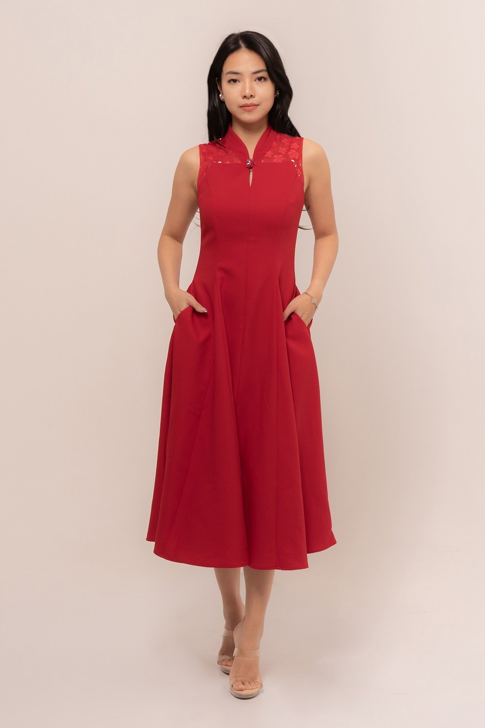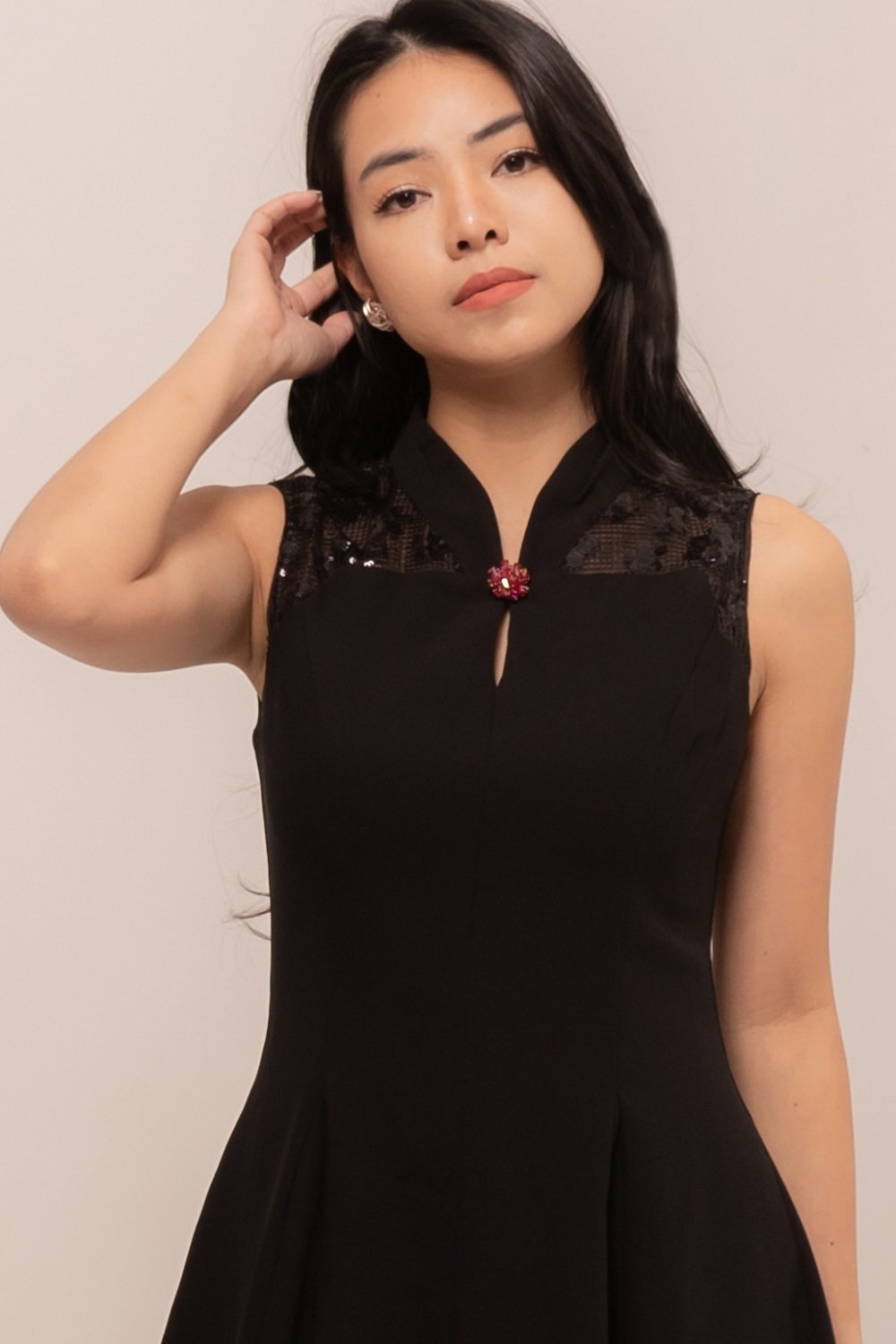 Effortlessly in this stunning Natalie Dress. Designed with a flattering A-line silhouette, delicate lace accents, and a graceful mandarin collar, it blends modern charm with timeless sophistication.
