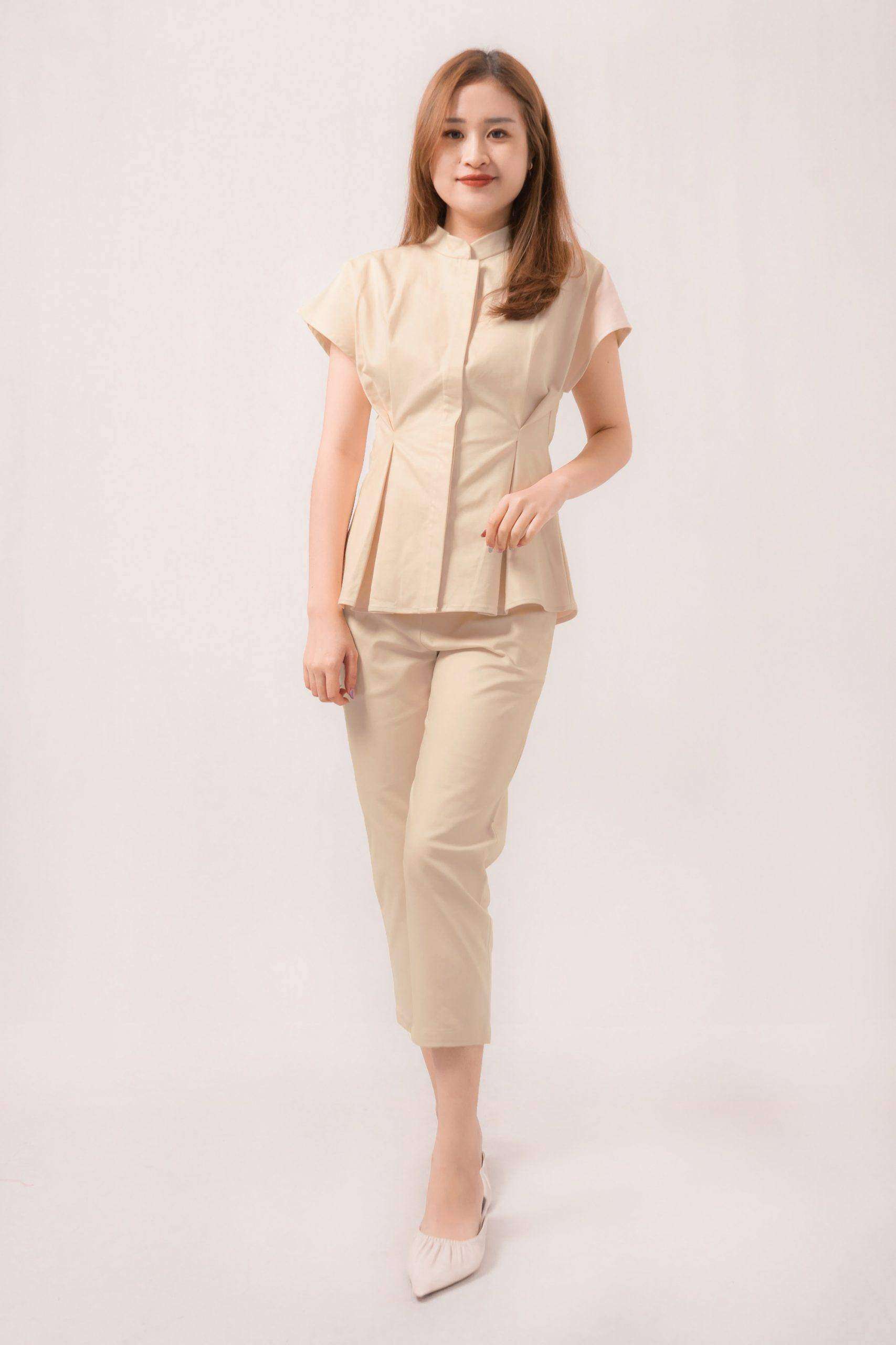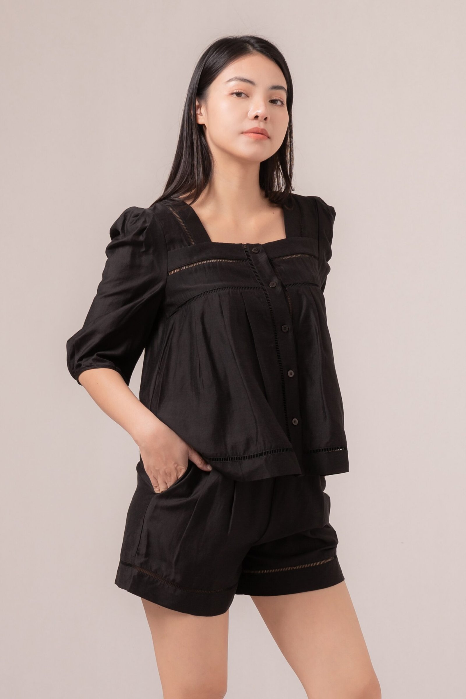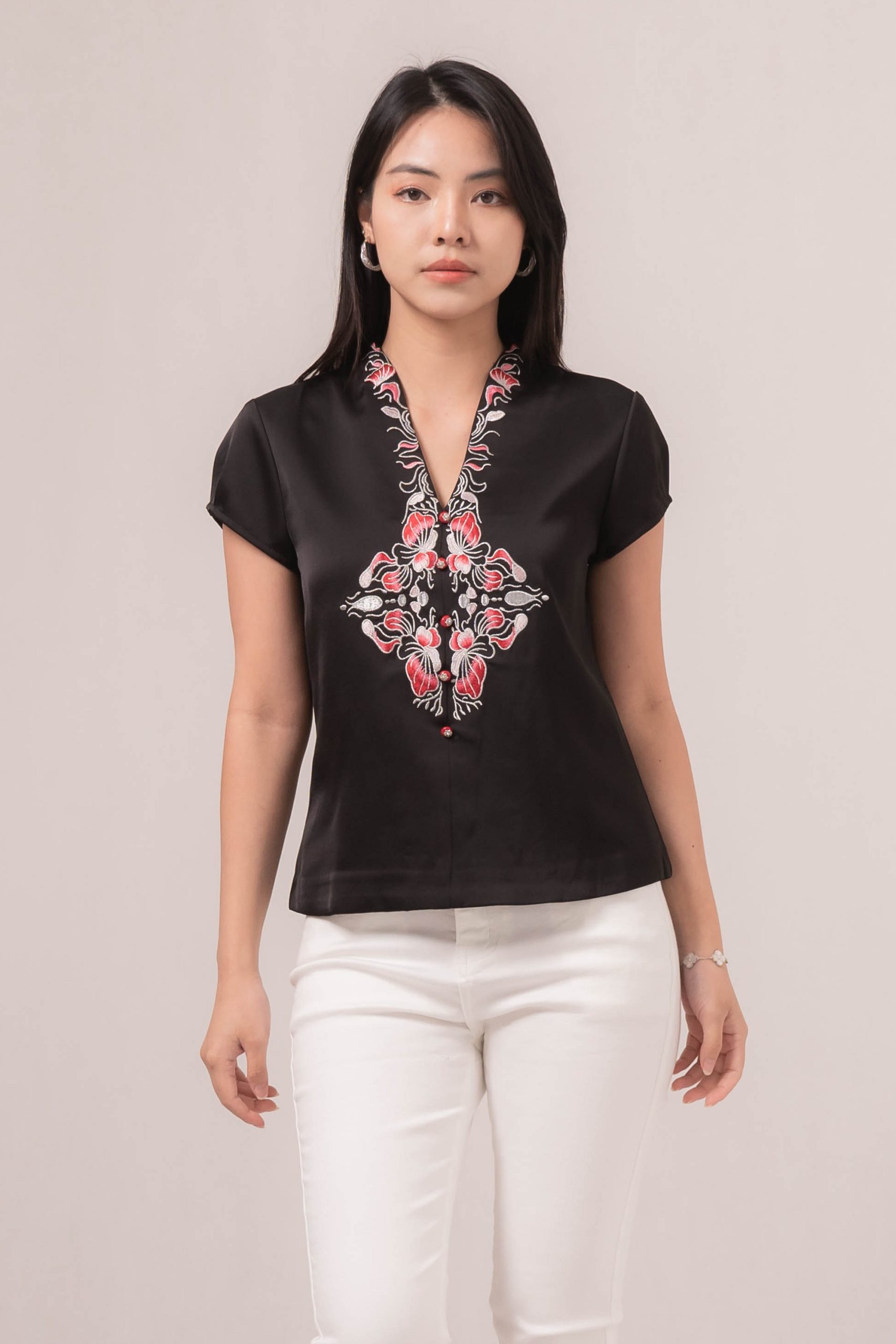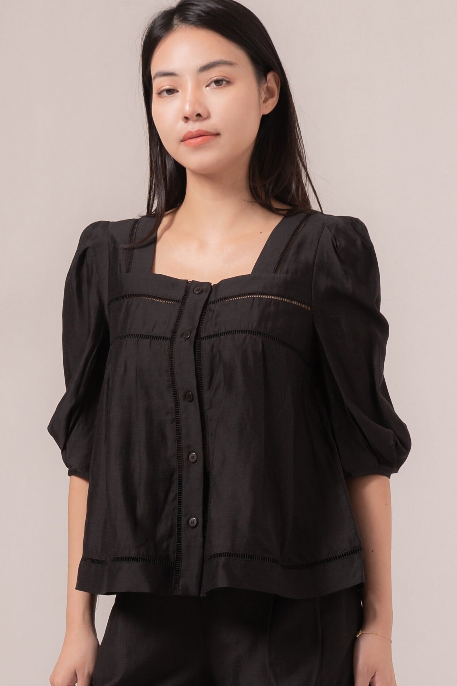 -Terdapat kancing fungsional pada bagian depan atasan