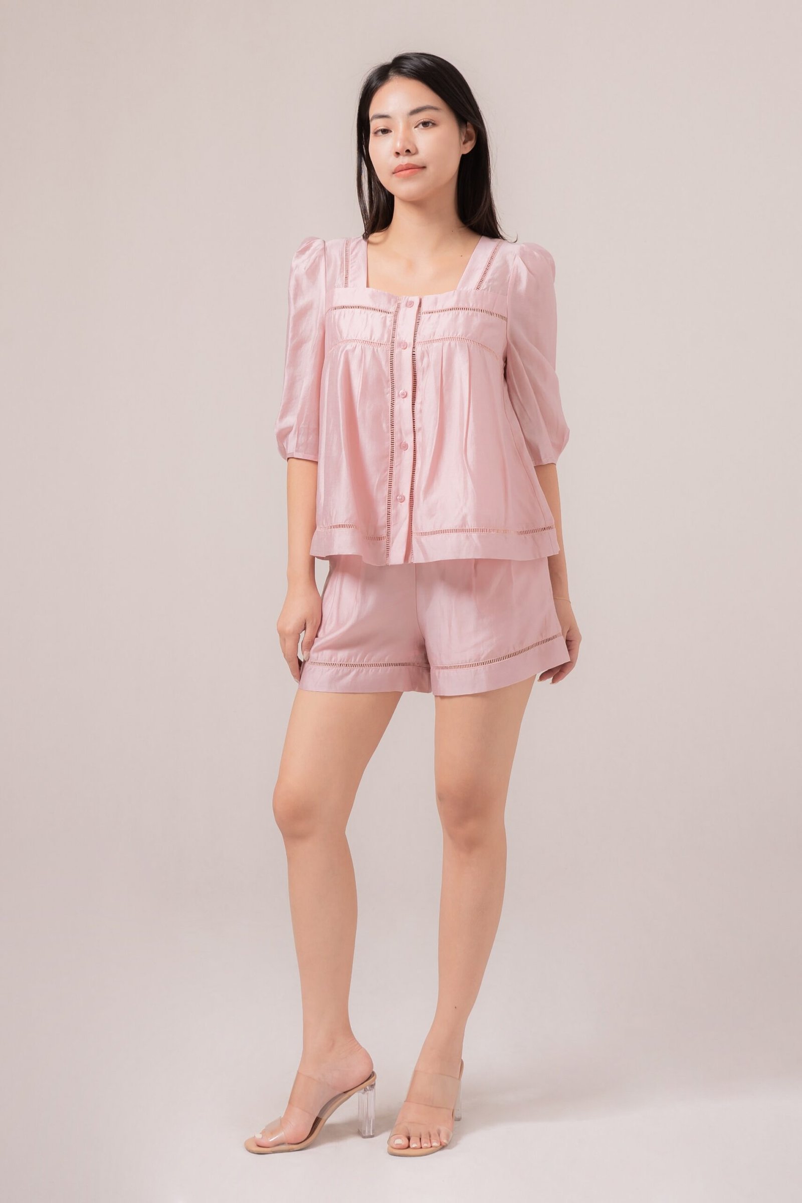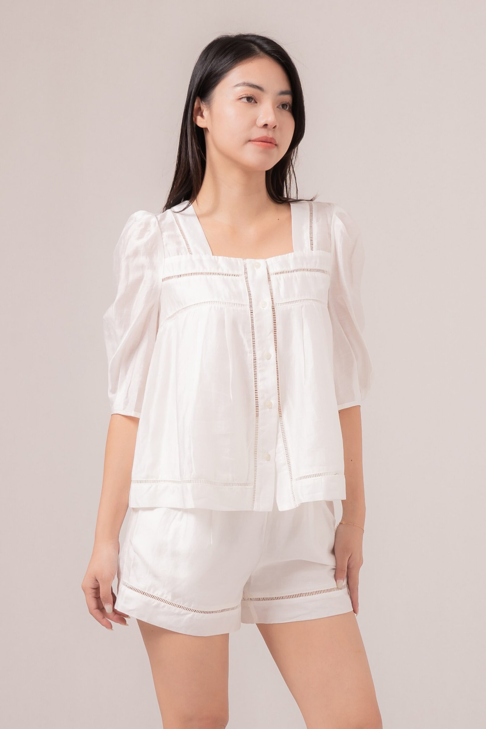 Setelan simpel dengan detail anglaise garis cantik yang dapat digunakan untuk hari santaimu