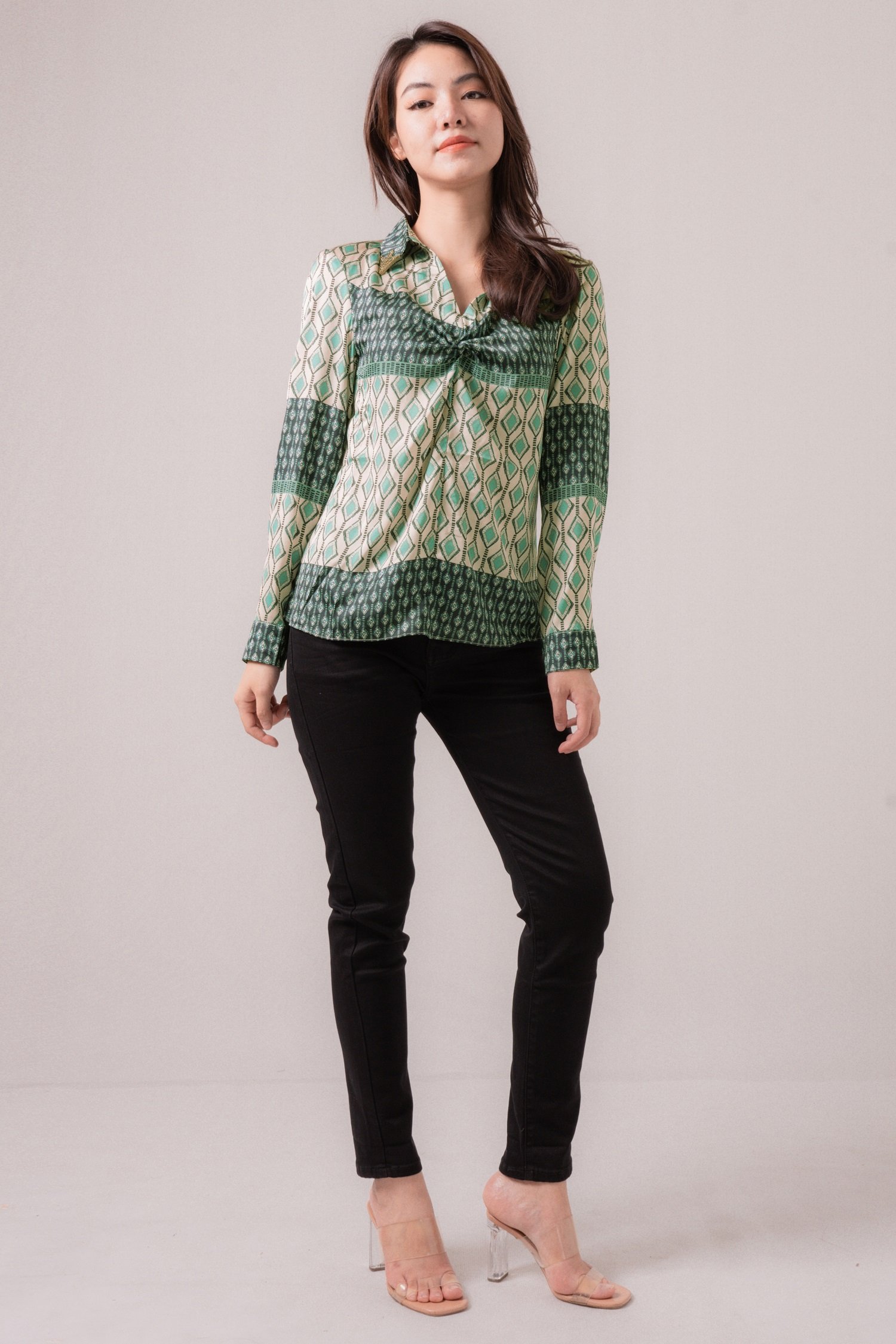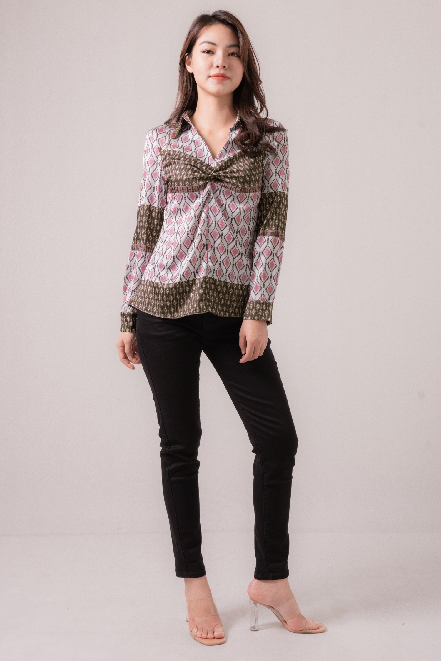A versatile piece for dress-up or dress-down days! Twisted front details.