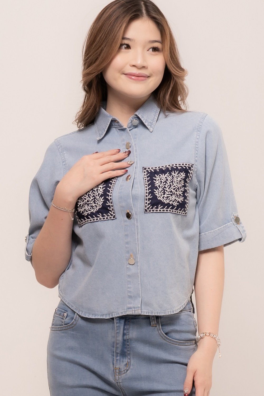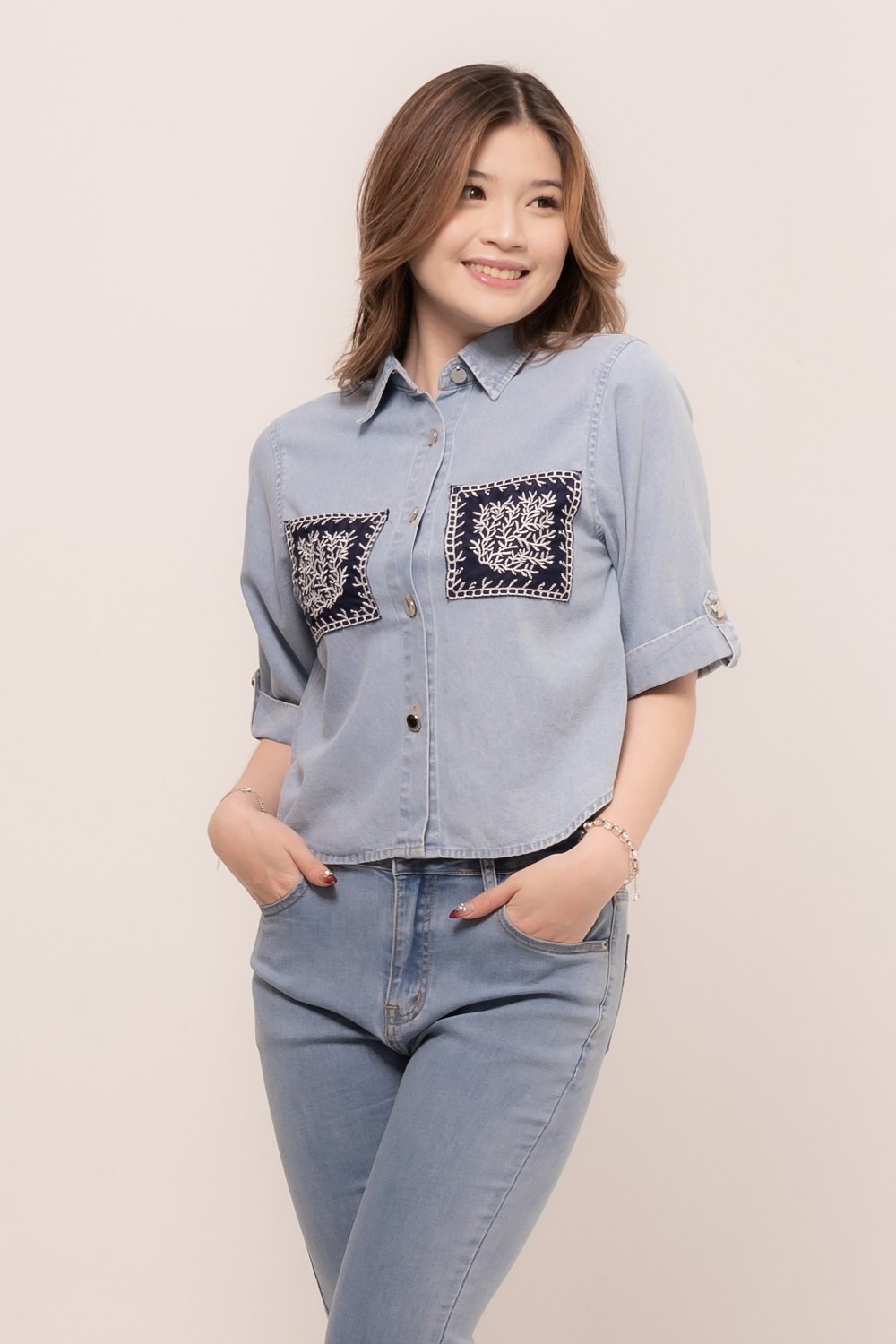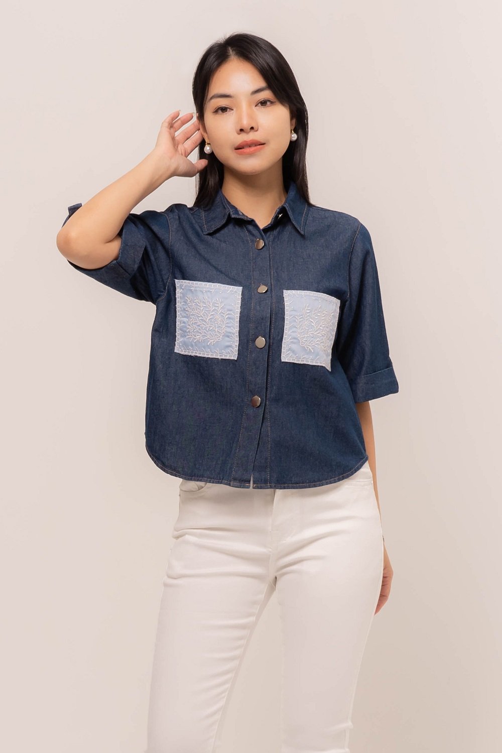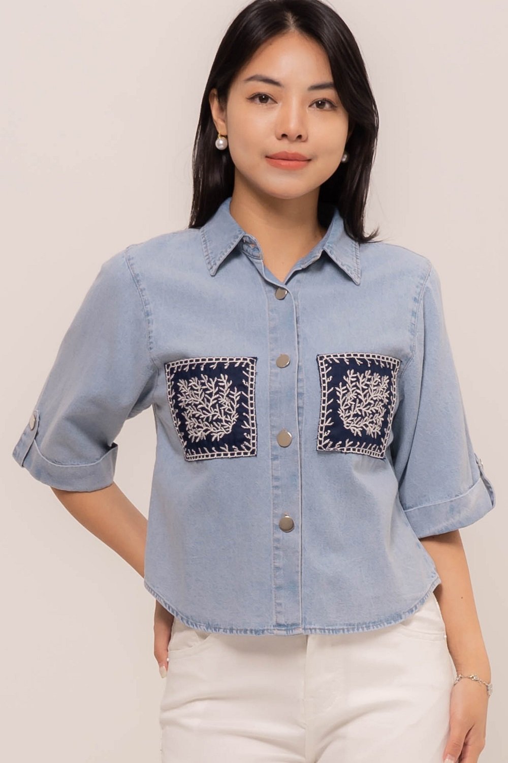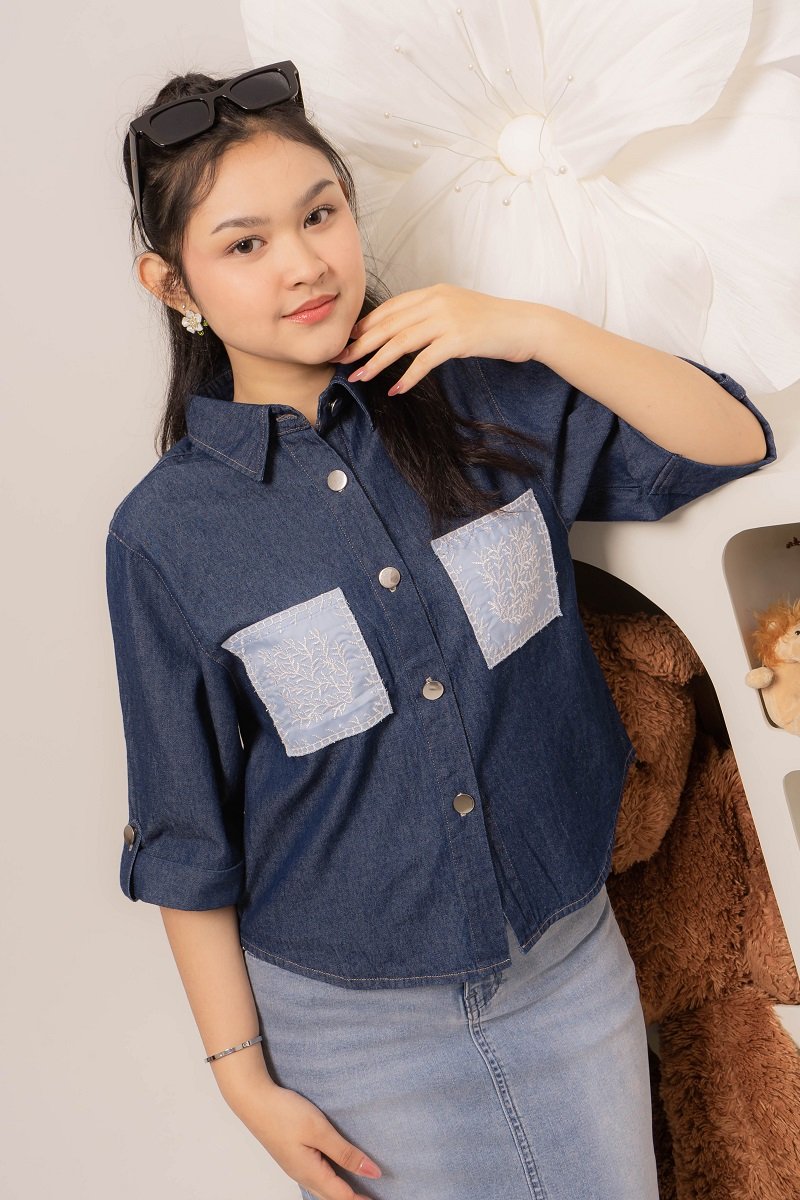 Pretty girl wear pretty clothes like our Aleecia Top! With its beautiful flower embroidery details on pocket, it adds a touch of sweet to your casual look