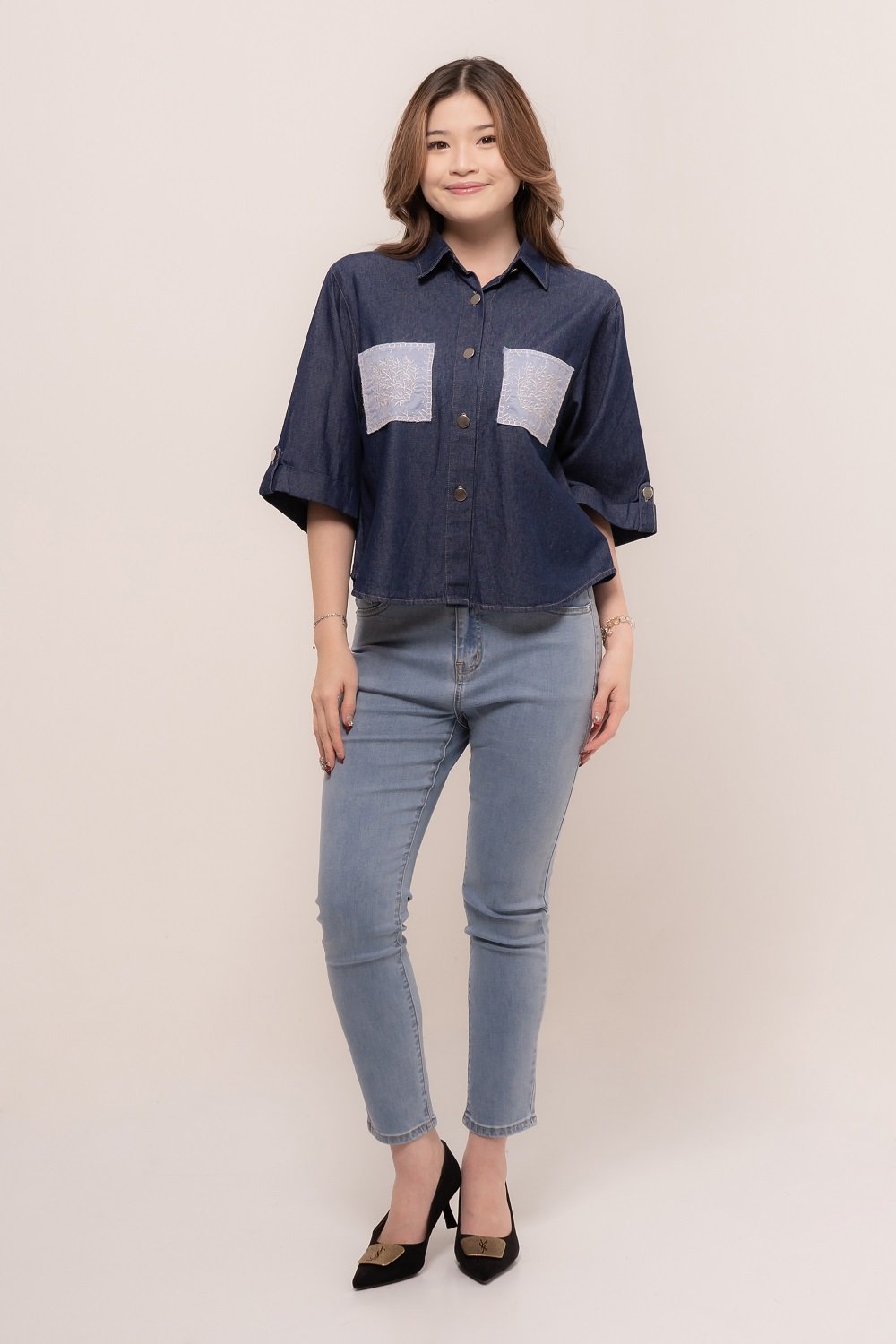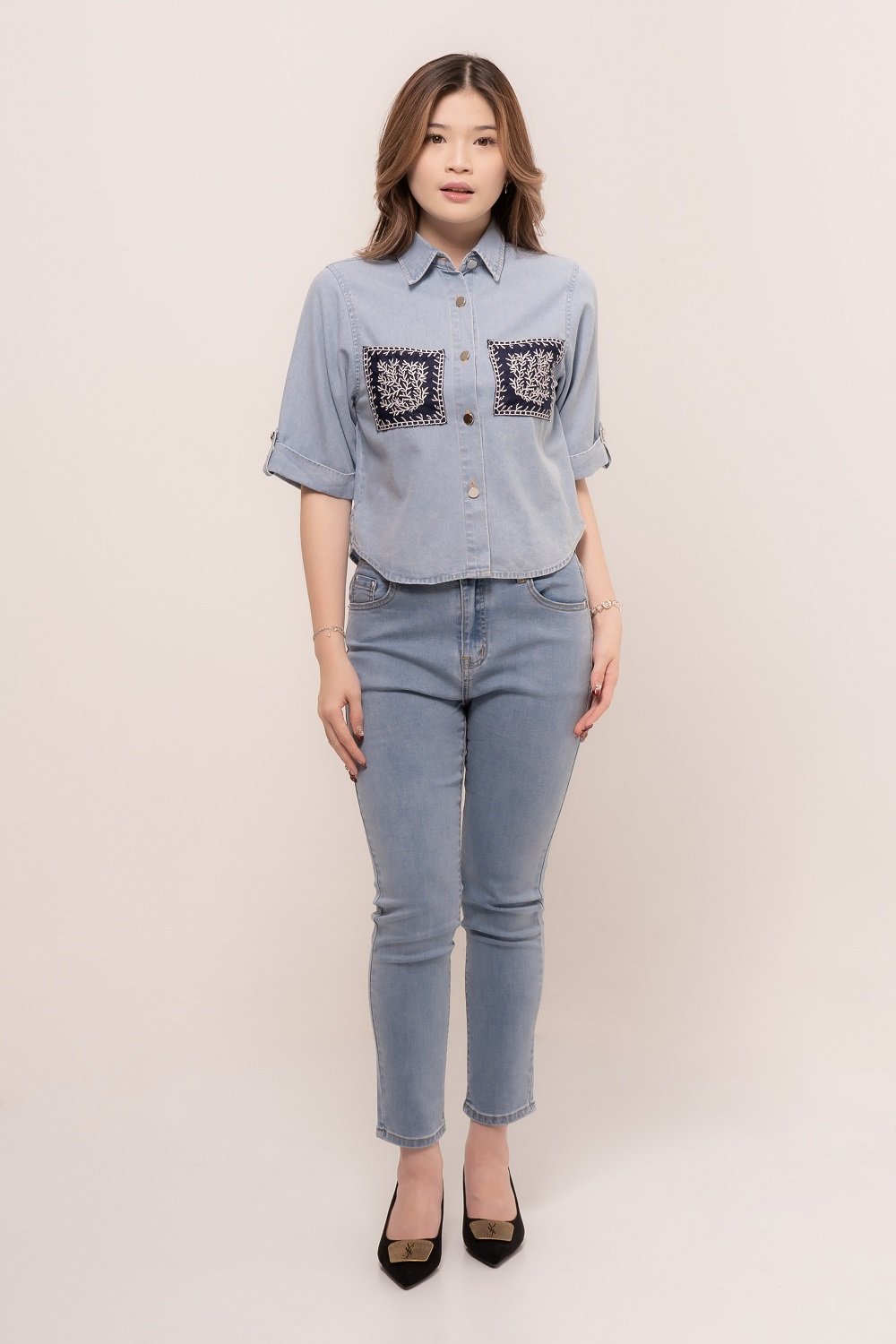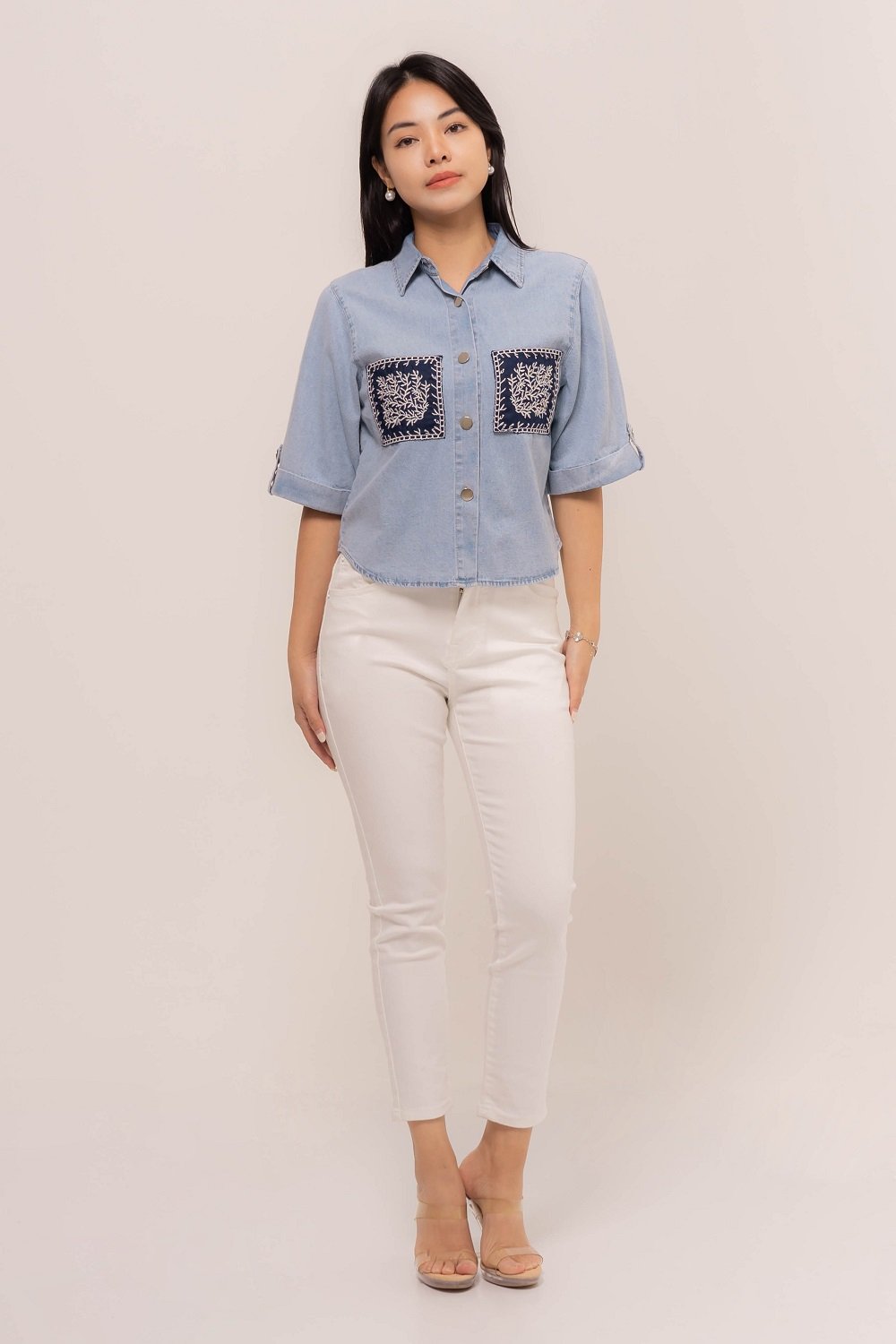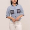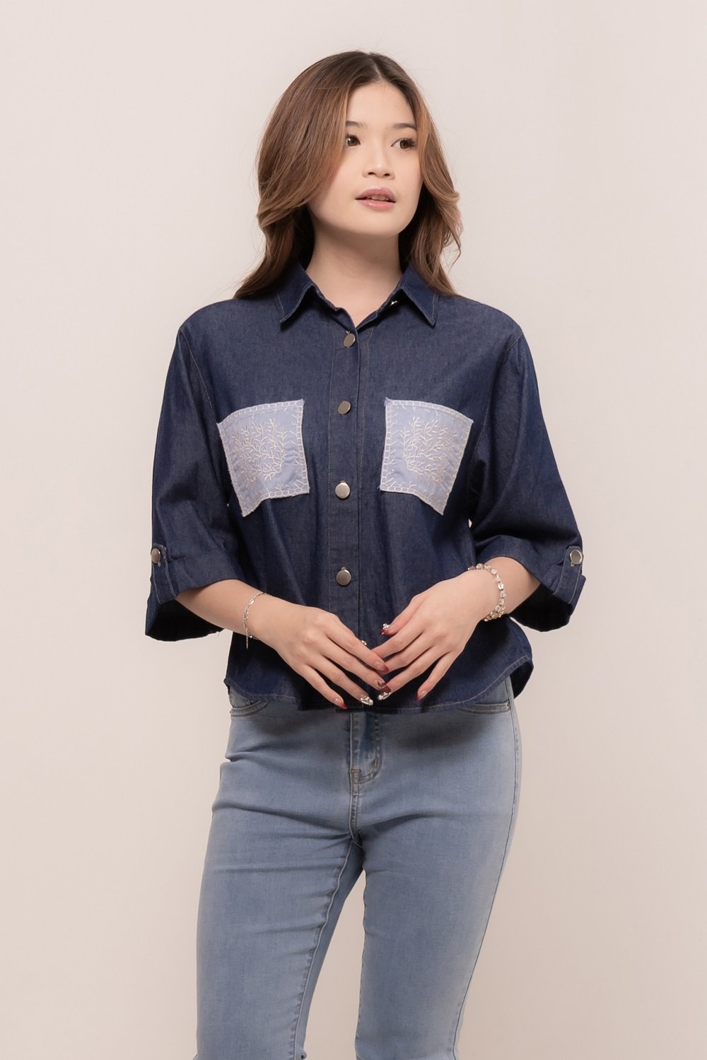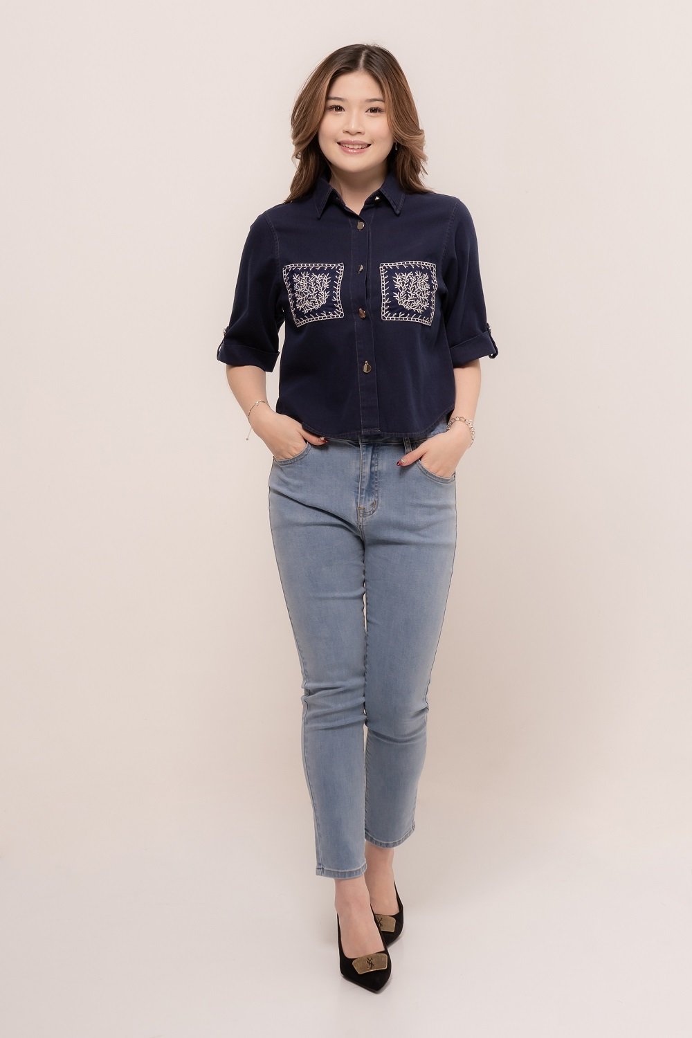 Pretty girl wear pretty clothes like our Aleecia Top! With its beautiful flower embroidery details on pocket, it adds a touch of sweet to your casual look