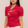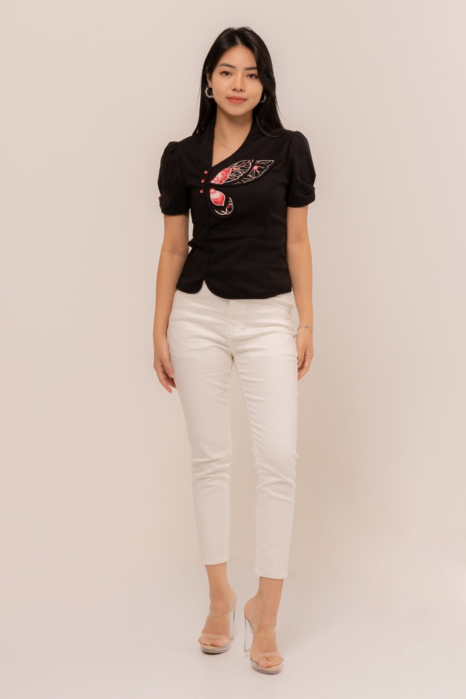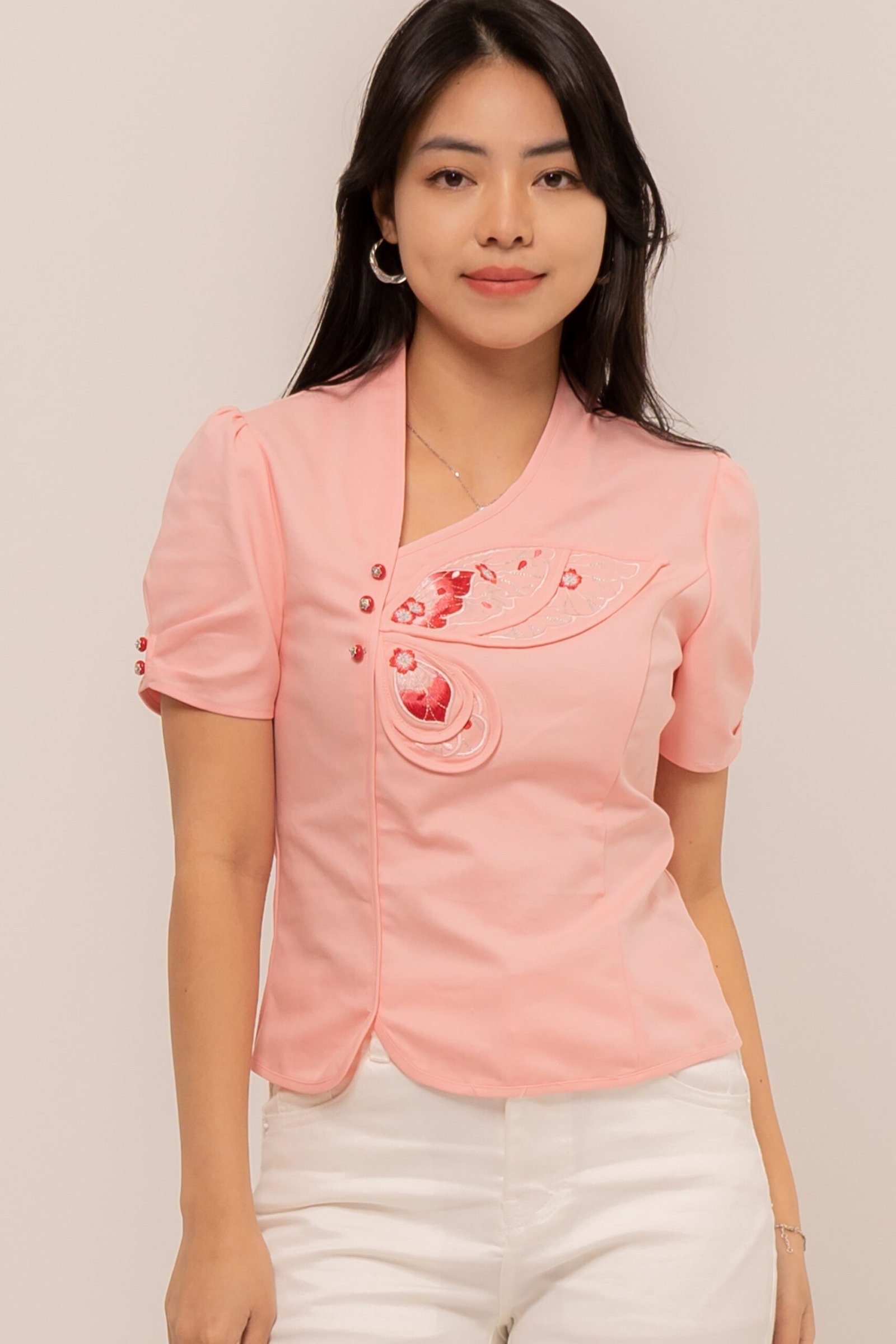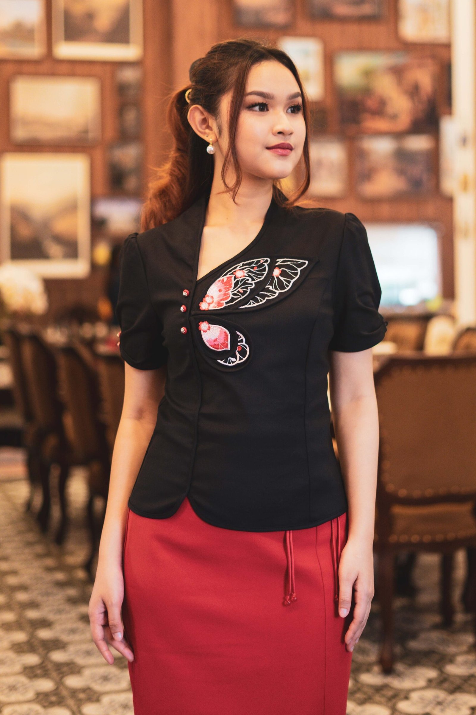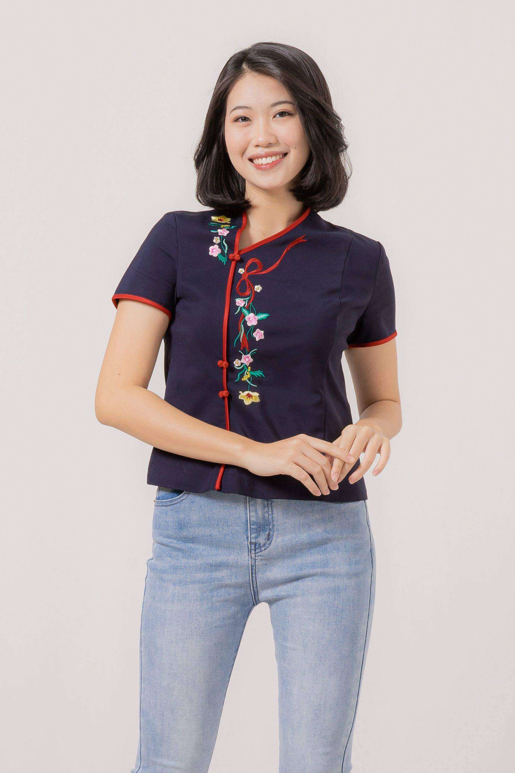 Indulge in the luxurious feel of this hand-embroidered Cheongsam. Its vibrant colors and intricate patterns tell a story of artistry and heritage, Yu Wei Top