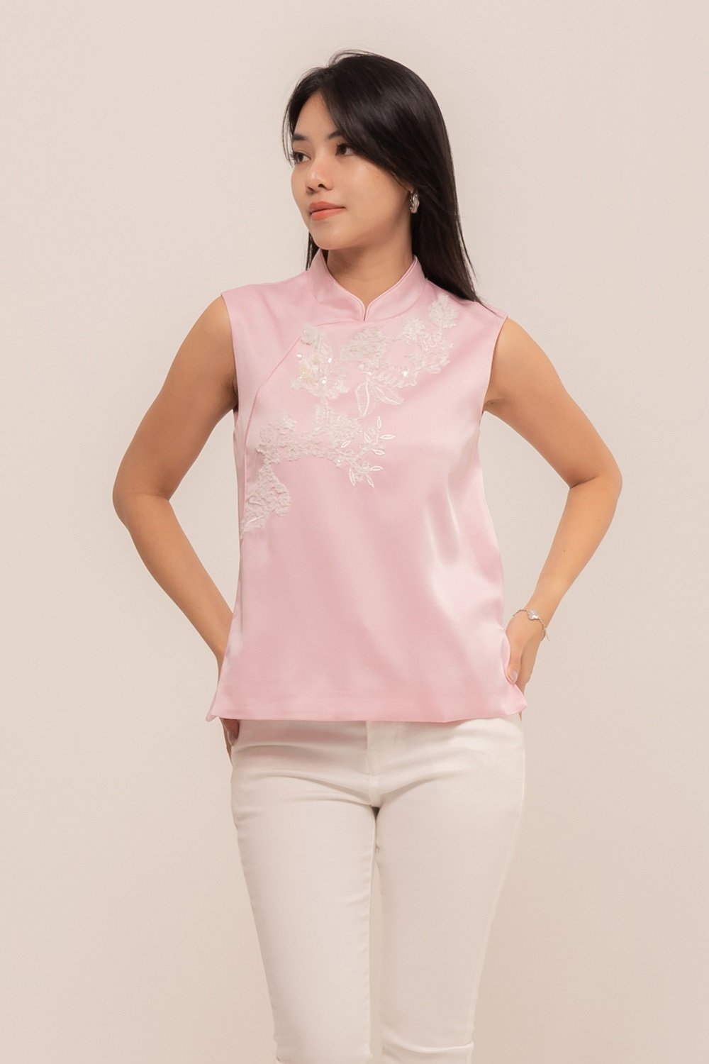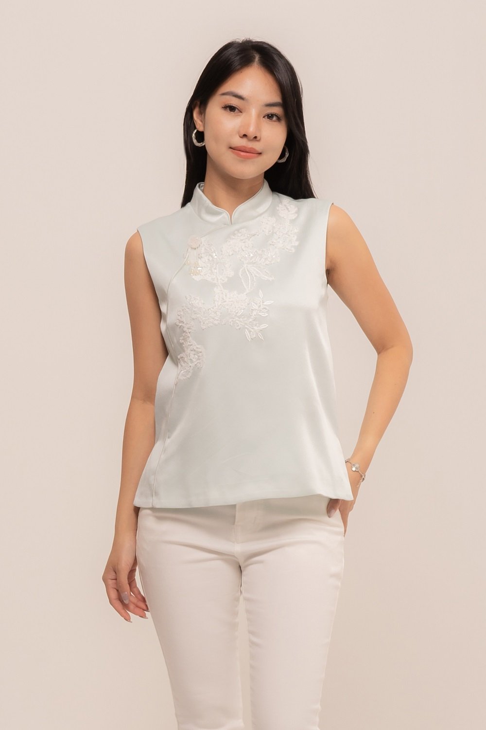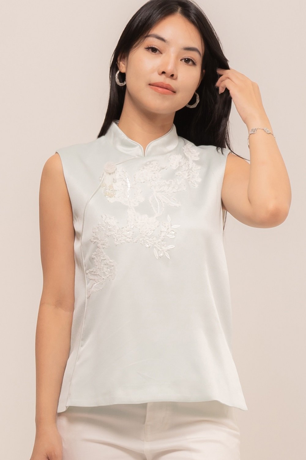 YueTing Top is crafted from the finest silk, which drapes beautifully over the body. The intricate details, such as the delicate embroidery and elegant button, add a touch of luxury and sophistication.